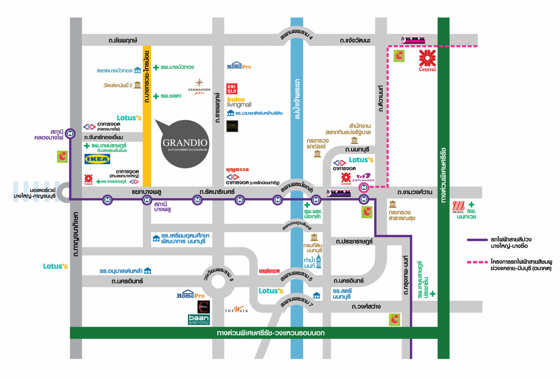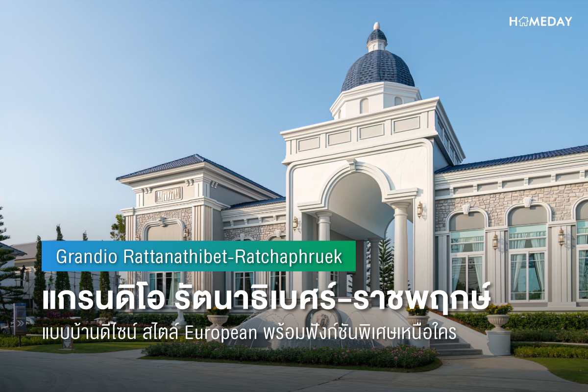 "แกรนดิโอ รัตนาธิเบศร์-ราชพฤกษ์ (Grandio Rattanathibet-Ratchaphruek) บรรยากาศโครงการ มาในภายใต้คอนเซ็ปต์ European Riverscape โดยมีแม่น้ำเป็นเส้นหลัก และจัดองค์ประกอบทิวทัศน์ภายในโครงการที่ได้รับแรงบรรดาลใจมาจาก Ramme Gaad Garden แห่งเมือง Oslo ประเทศนอร์เวย์ สะท้อนรสนิยมผู้อยู่อาศัย เพื่อการใช้ชีวิตที่สมบูรณ์แบบ ในสังคมคุณภาพ และชีวิตที่เหนือระดับ ที่ประกอบไปด้วยสวนสนุกท่ามกลางธรรมชาติ, Gazebo Garden ที่นั่งพักผ่อนในสวนขนาดใหญ่, Street Basketball และอื่นๆ อีกมากมาย"