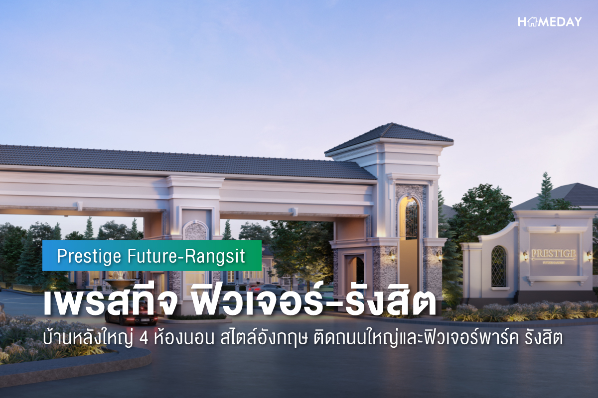 "เพรสทีจ ฟิวเจอร์-รังสิต (Prestige Future-Rangsit) สวย GOOD DESIGN ด้วยกลิ่นอายสถาปัตยกรรมยุโรปร่วมสมัย ให้ความโอ่อ่าภูมิฐาน หิน บัวประดับ ปูนปั้น เหล็กดัดแนวระเบียงลวดลายพิเศษ ช่วยเพิ่มความหรูหรา มาตรฐานวัสดุชั้นนำ กระเบื้องห้องน้ำดีไซน์พิเศษ ประตู หน้าต่าง UPVC โคมไฟ Downlight ทั้งหลัง ฝ้าเพดานสูง 2.7 เมตร"