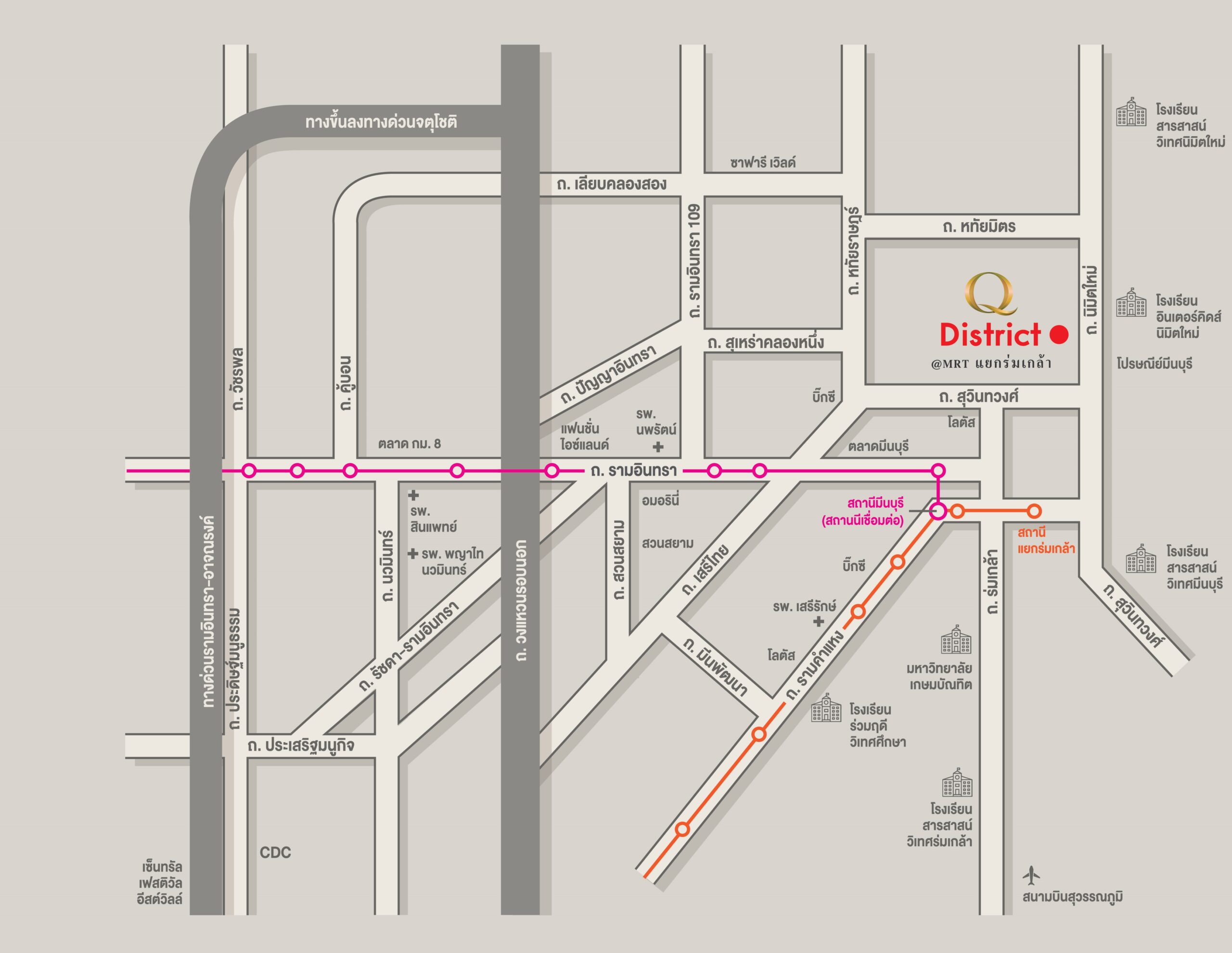 รถไฟฟ้าสายสีส้ม สถานีแยกร่มเกล้า ~2.5 กม.รถไฟฟ้าสถานีมีนบุรี Interchange สายสีส้ม & สีชมพู ~3.3 กม.ทางด่วนกาญจนาภิเษก (วงแหวนรอบนอก) ~9.5 กม.