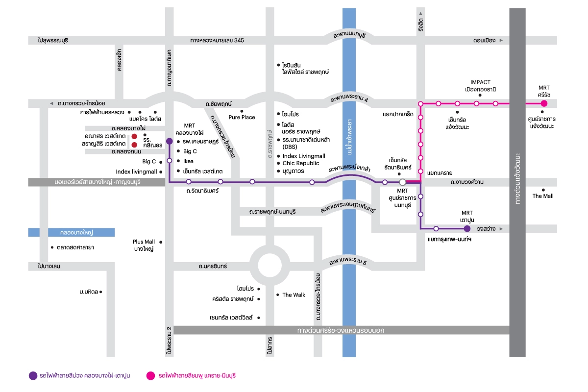 ถ.กาญจนาภิเษก 1.6 กม.ถ.รัตนาธิเบศร์ 5.4 กม.ถ.ชัยพฤกษ์ 6.5 กม.ถ.ราชพฤกษ์ 9.6 กม.ทางพิเศษประจิมรัถยา (ด่านฉิมพลี) 14.2 กม.