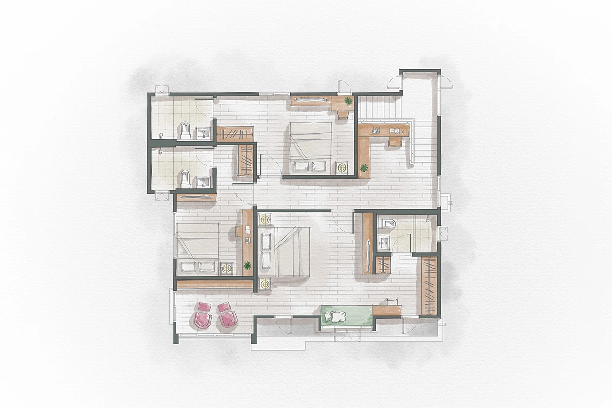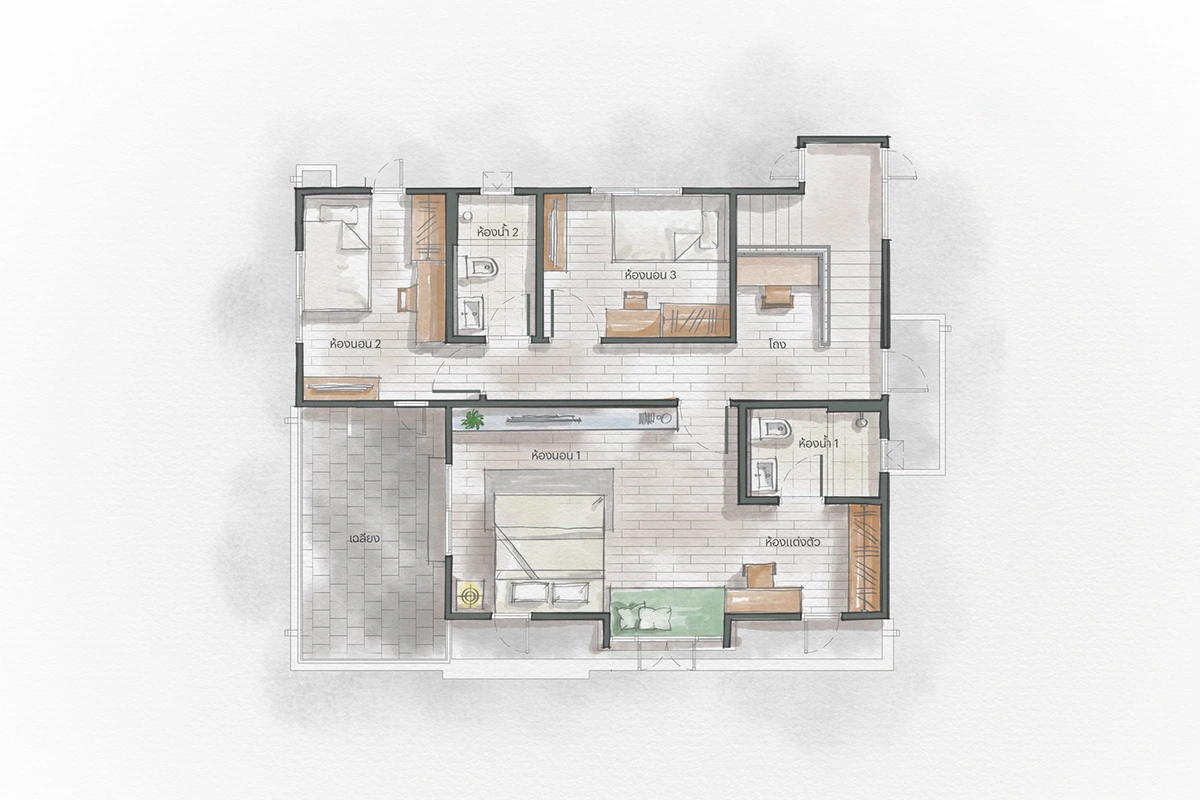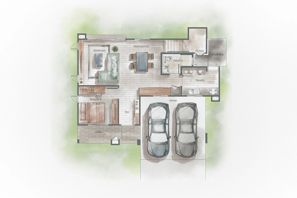 พื้นที่ใช้สอย 197 ตร.ม. 4 ห้องนอน 3 ห้องน้ำ 1 ห้องรับแขก ส่วนรับประทานอาหาร ห้องครัว ที่จอดรถ 2 คัน