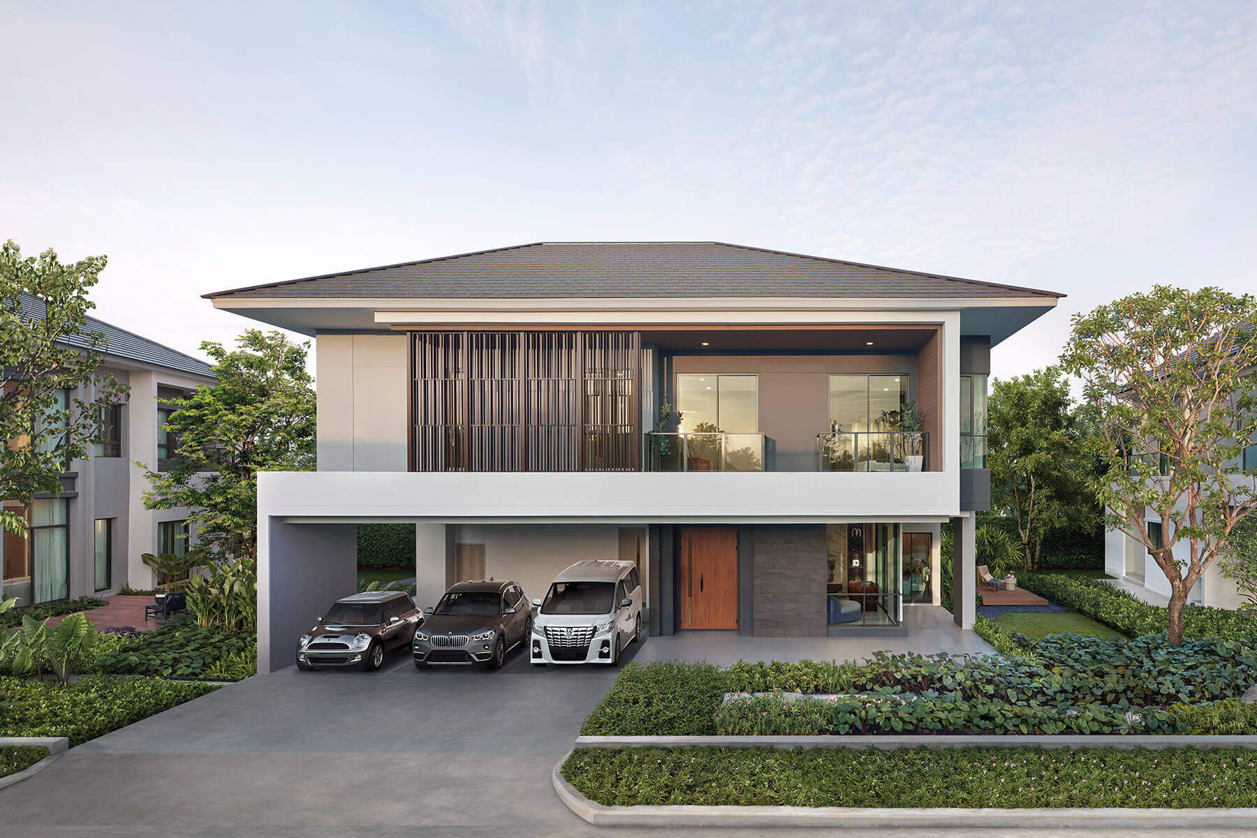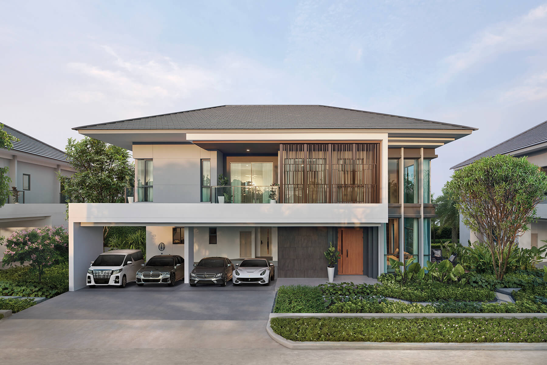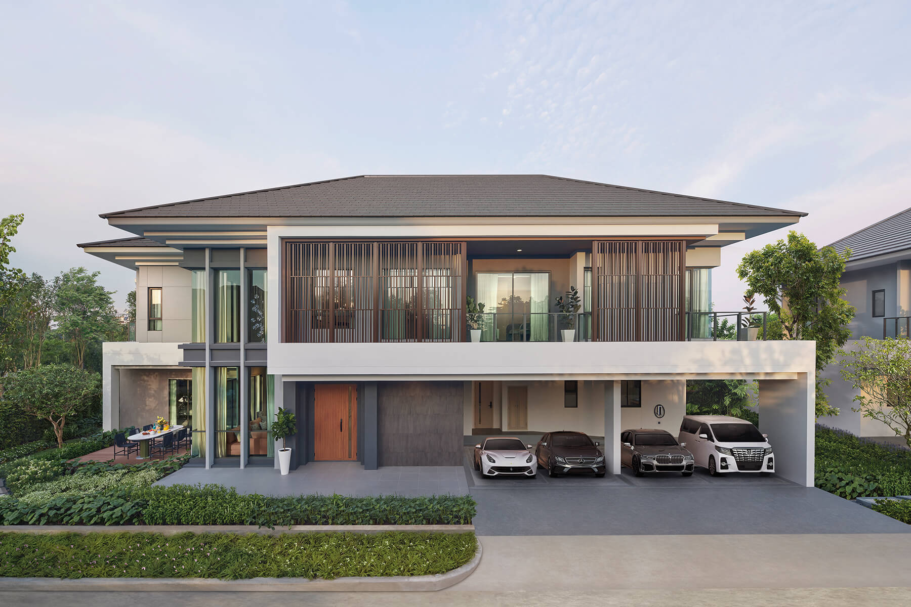 แบบบ้าน : RESIDENCE III พื้นที่ใช้สอย 392 ตร.ม. ฟังก์ชันบ้าน 4 ห้องนอน, 5 ห้องน้ำ, 1 ห้องรับแขก, 2 ห้องพักผ่อน, 1 ห้องครัว, 1 ห้องแม่บ้าน และ 4 ที่จอดรถ