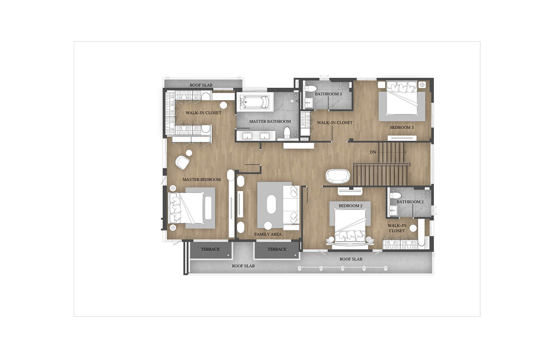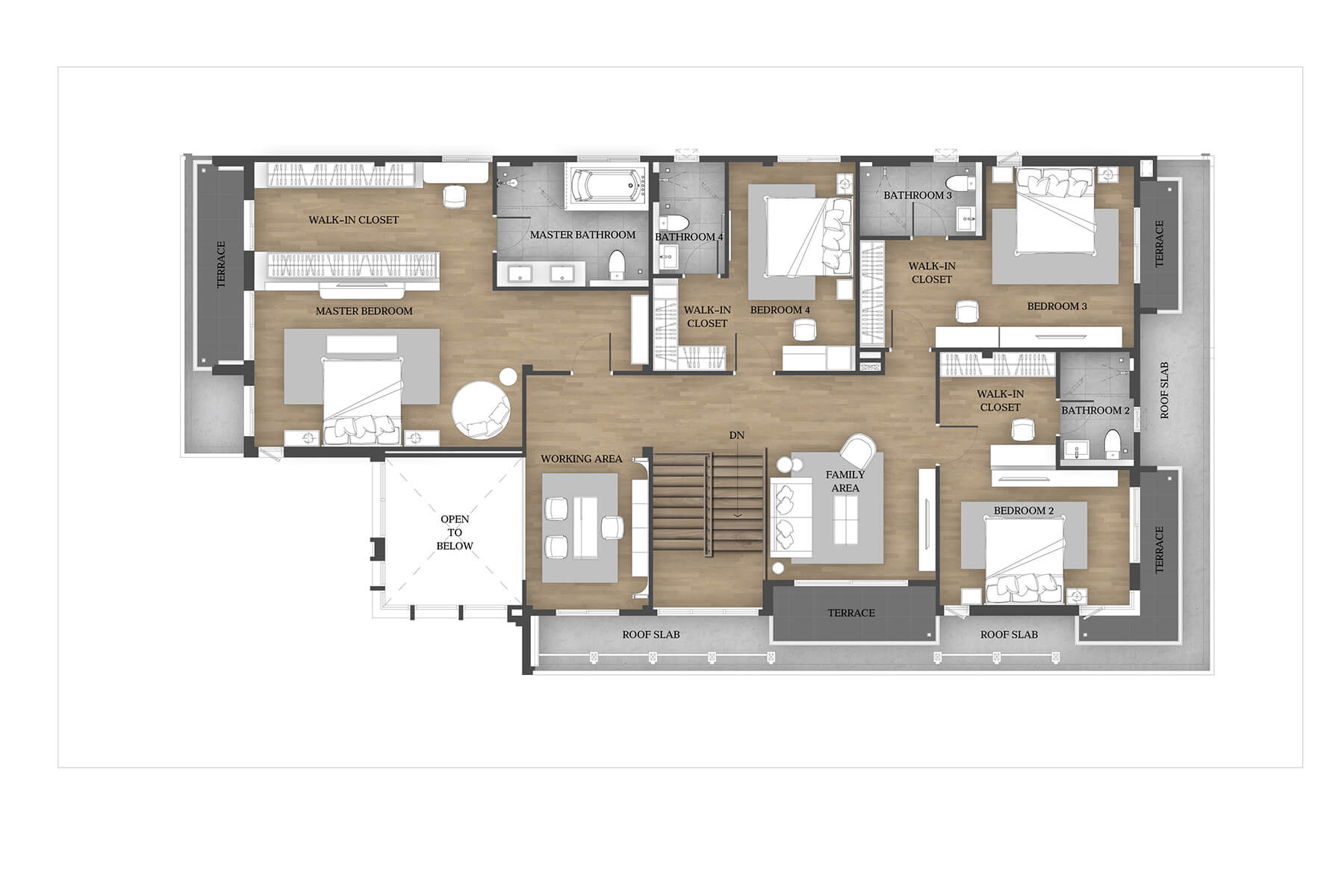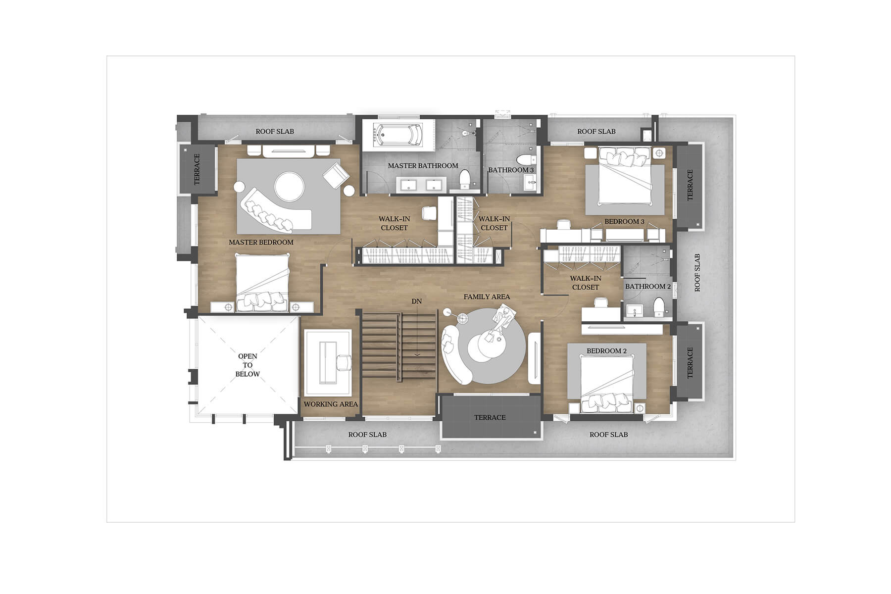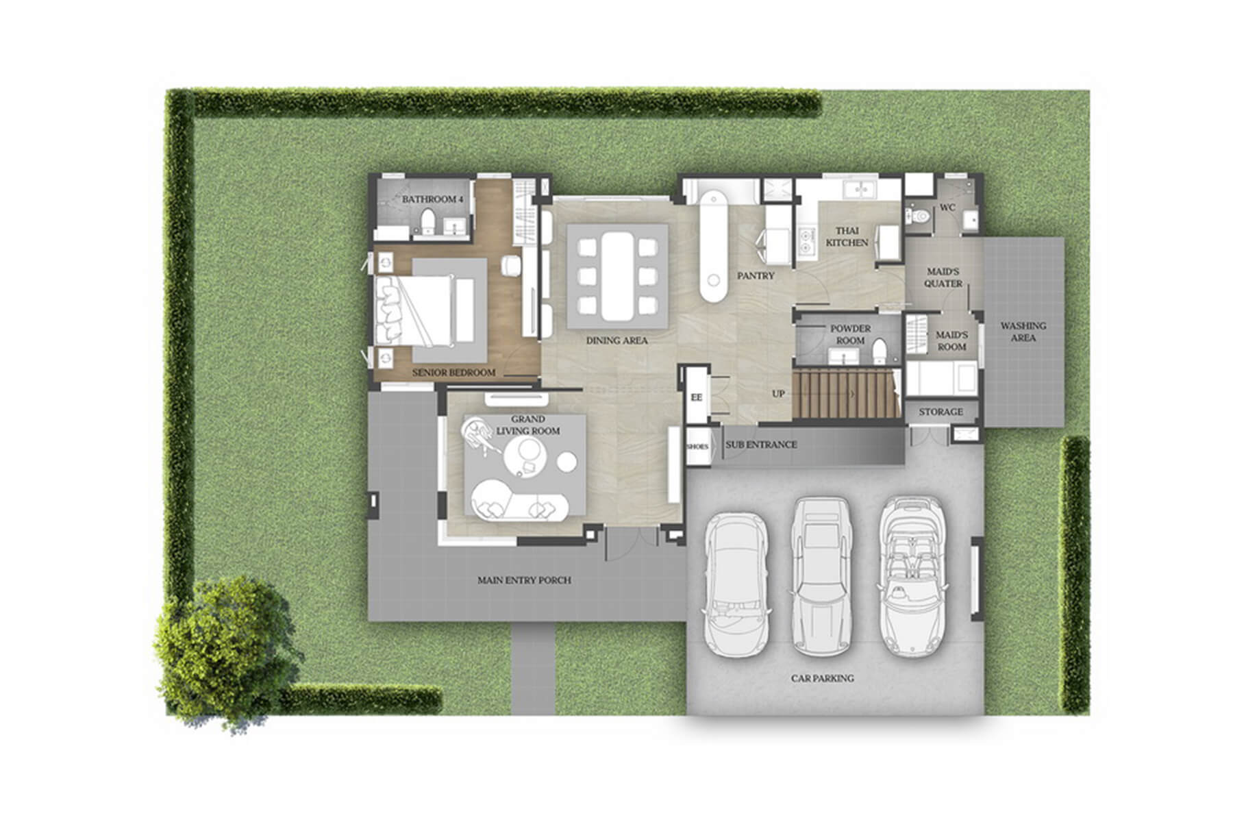 แบบบ้าน : RESIDENCE III พื้นที่ใช้สอย 392 ตร.ม. ฟังก์ชันบ้าน 4 ห้องนอน, 5 ห้องน้ำ, 1 ห้องรับแขก, 2 ห้องพักผ่อน, 1 ห้องครัว, 1 ห้องแม่บ้าน และ 4 ที่จอดรถ