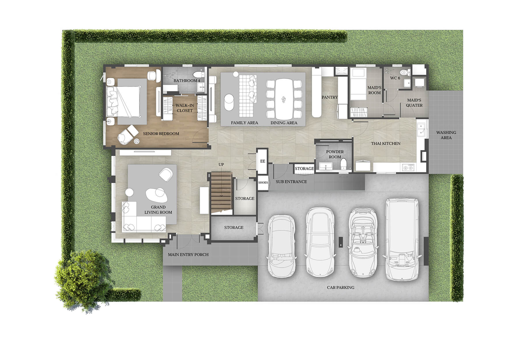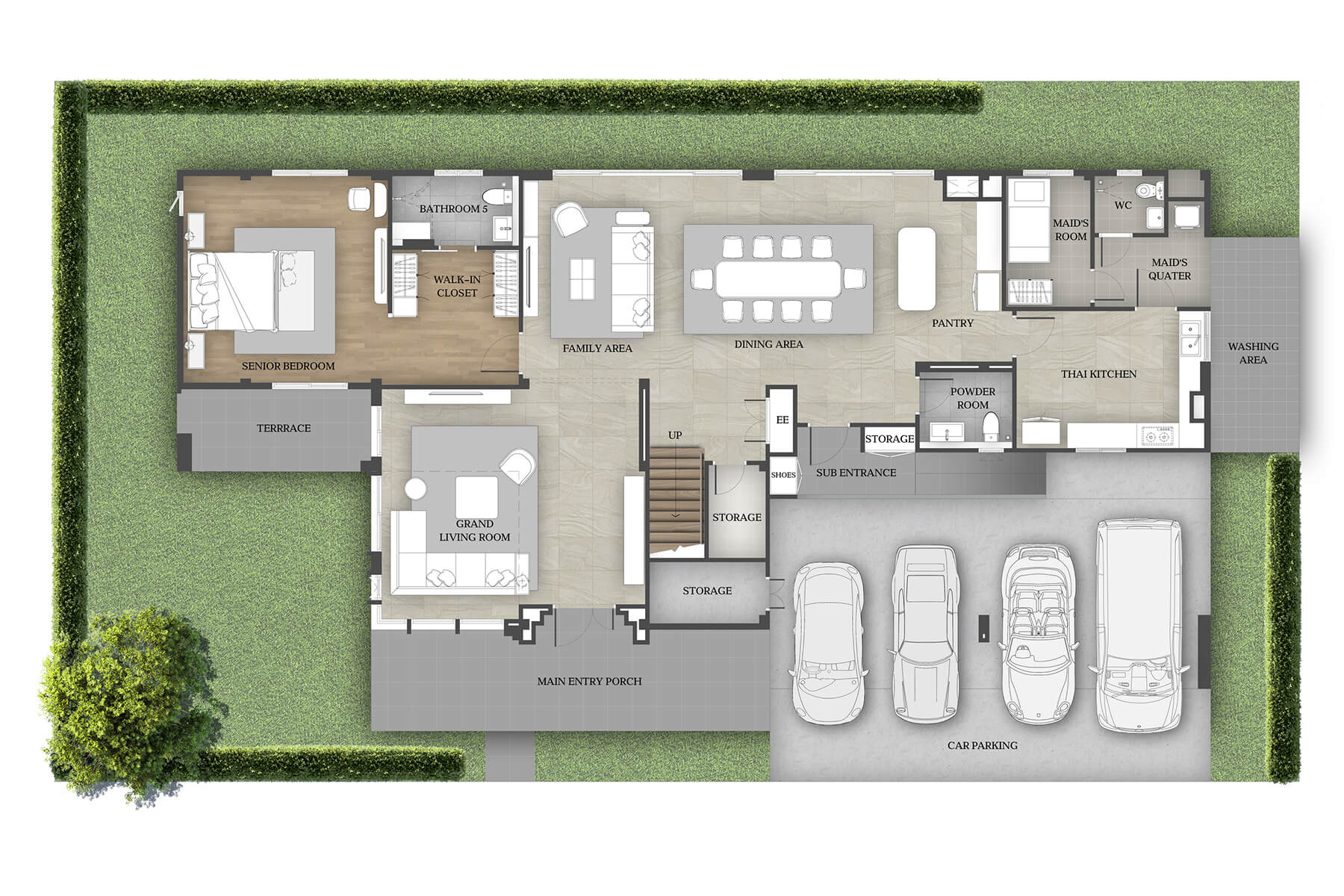 แบบบ้าน : RESIDENCE I พื้นที่ใช้สอย 474 ตร.ม. ฟังก์ชันบ้าน 5 ห้องนอน, 6 ห้องน้ำ, 1 ห้องรับแขก, 2 ห้องพักผ่อน, 1 ห้องครัว, 1 ห้องแม่บ้าน และ 4 ที่จอดรถ