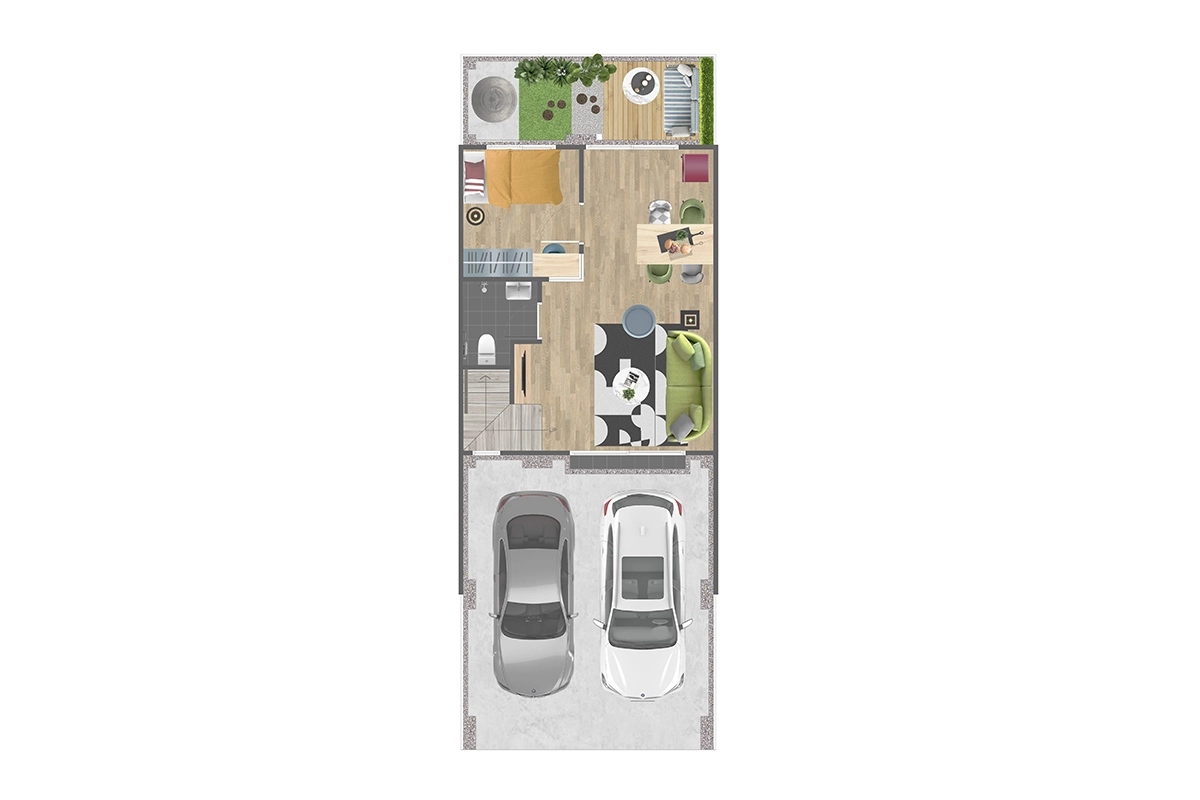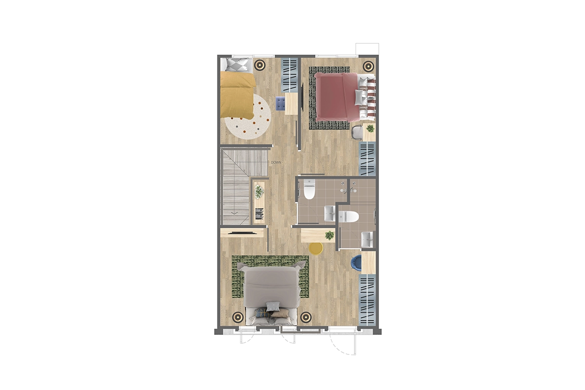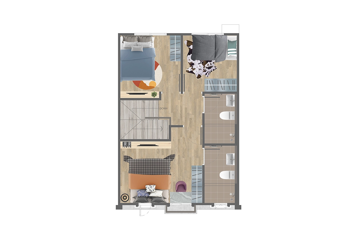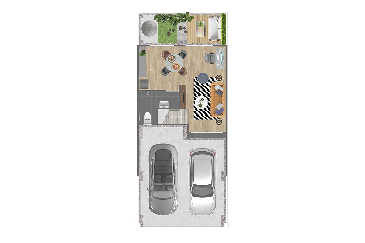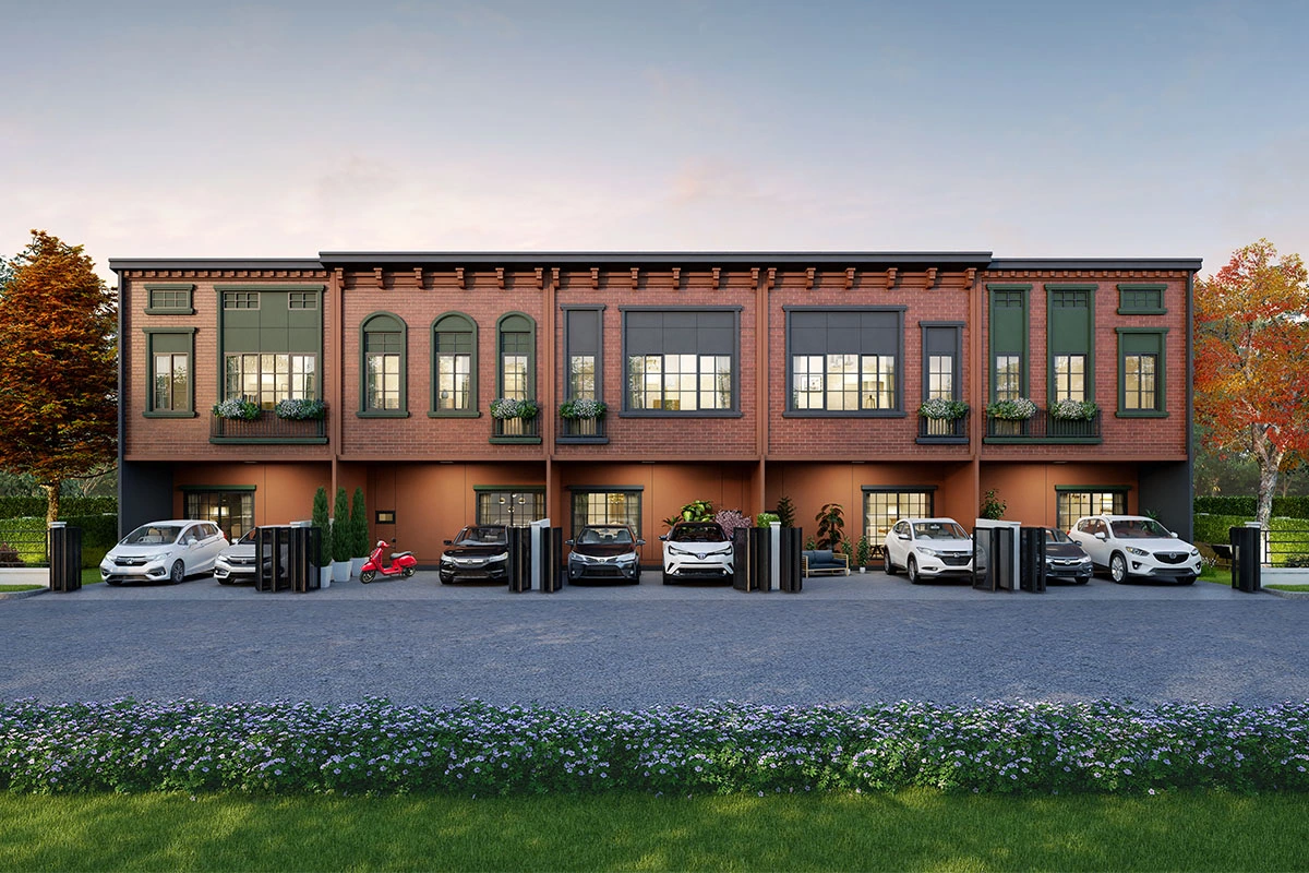 พื้นที่ใช้สอย 111 ตร.ม. ทาวน์โฮม 2 ชั้น หน้ากว้าง 5.5 เมตร 3 ห้องนอน 3 ห้องน้ำ 1 ห้องรับแขก ส่วนรับประทานอาหาร ส่วนซักล้าง ที่จอดรถ 2 คัน