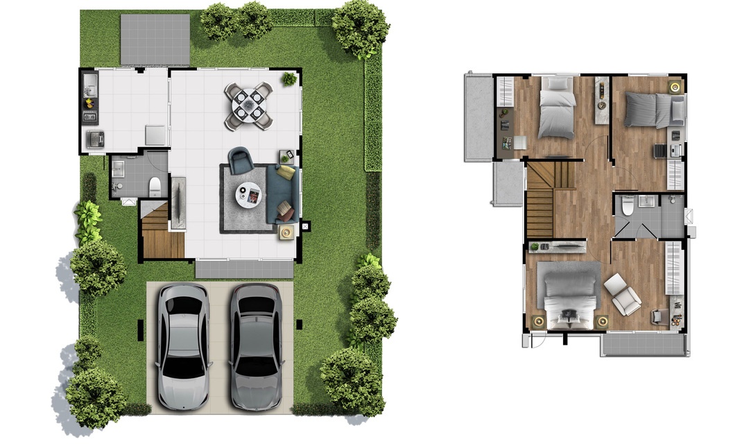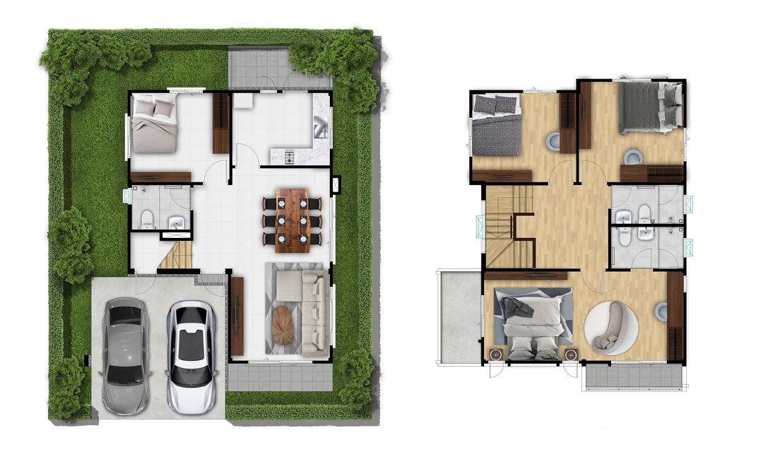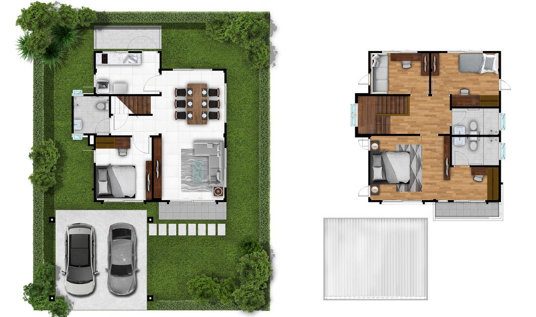 แบบบ้าน : ศุภรดา บ้านเดี่ยว 2 ชั้น พื้นที่ใช้สอย 163 ตร.ม. 4 ห้องนอน 3 ห้องน้ำ ออกแบบห้องนอนใหญ่มีขนาดใหญ่กว่า 25 ตร.ม. ห้องนอนชั้นล่าง จัดเตรียมไว้เพื่อเป็นห้องนอนสำหรับผู้สูงอายุ หรือปรับใช้เป็นห้องอเนกประสงค์