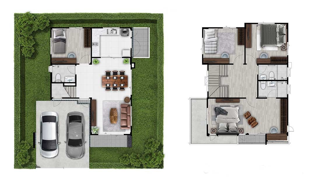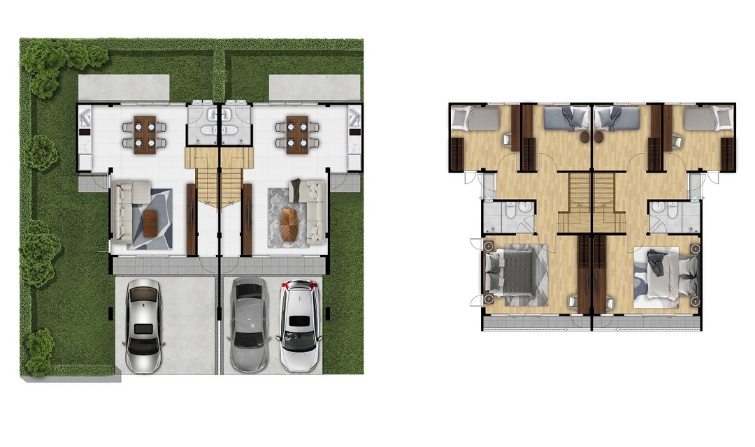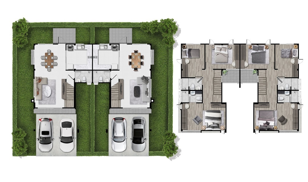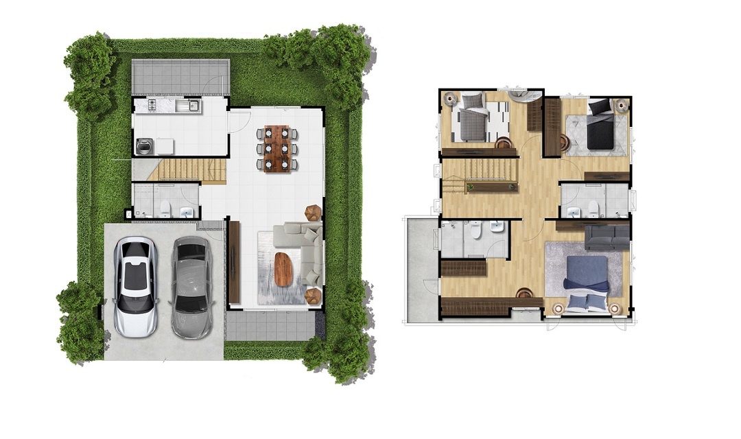 บ้านเดี่ยว 2 ชั้น พื้นที่ใช้สอย 208 ตร.ม. 4 ห้องนอน 3 ห้องน้ำ 2 ที่จอดรถ