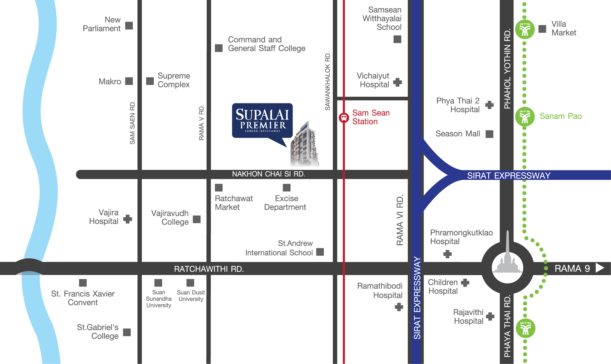 การเดินทาง ถนนนวมินทร์ประเสริฐมนูกิจ 48แยกบางกะปิรถไฟฟ้าสายสีเหลืองแยกลำสาลีถนนประดิษฐ์มนูธรรมเลียบทางด่วนรามอินทราทางพิเศษฉลองรัชรามอินทรา กม.8รถไฟฟ้าสายชมพูทาง
