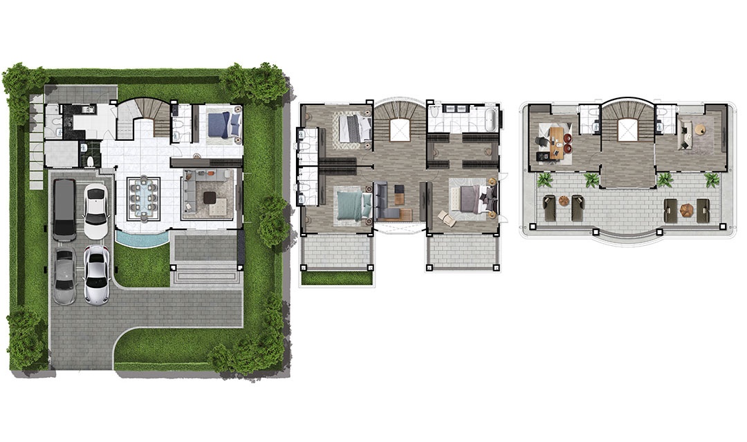 แบบบ้าน : STELLA บ้านรุ่นใหม่ 3 ชั้น พื้นที่ใช้สอย 480 ตร.ม.4 ห้องนอน 7 ห้องน้ำ 2 ห้องพักผ่อน การออกแบบสำหรับครอบครัวใหญ่ที่ต้องการความเป็นพิเศษของการอยู่อาศัยพร้อมด้วยประโยชน์ใช้สอยที่ครบถ้วน โอ่โถงด้วยการออกแบบด้วยช่องกระจกสู่จากพื้นถึงเพดานตรงกลาง เชื่อมบรรยากาศภายนอกสู่ภายใน รวมถึงได้รับแสงสว่างที่มากขึ้น และตกแต่งด้วยราวเหล็ก WROUGH IRON ที่ระเบียง เพิ่มความหรูหราให้กับตัวบ้าน