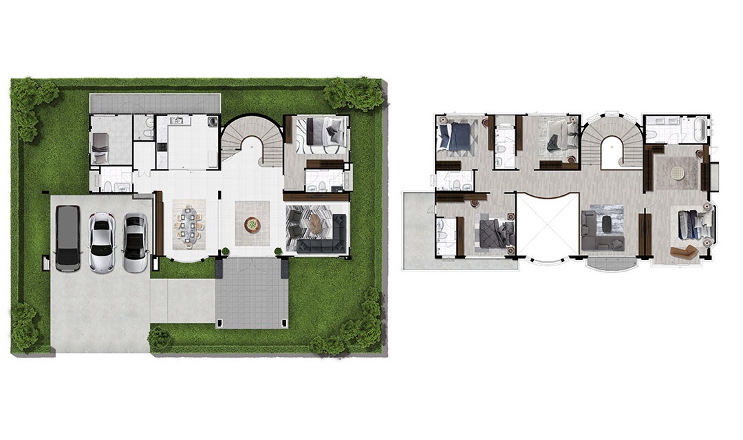 แบบบ้าน : GROSSO บ้านเดี่ยว 2 ชั้น พื้นที่ใช้สอย 295 ตร.ม. 4 ห้องนอน 6 ห้องน้ำ พื้นที่ห้องรับแขก ห้องรับประทานอาหารและโถง เปิดโล่งเชื่อมถึงกันให้ความรู้สึกโปร่งสบาย ห้องรับประทานอาหาร ออกแบบให้มีประตูกระจกเปิดสู่พื้นที่ด้านข้างบ้าน สัมผัสกับบรรยากาศสวนภายนอกได้ ห้องนอนชั้นล่างใช้เป็นห้องนอนผู้สูงอายุได้ มีห้องน้ำในตัว