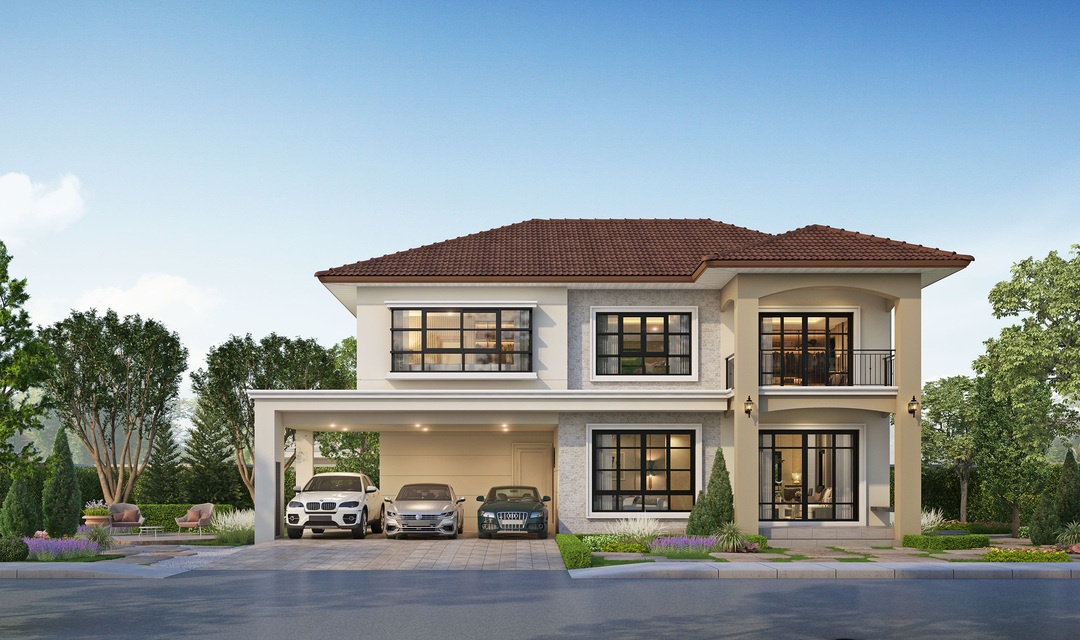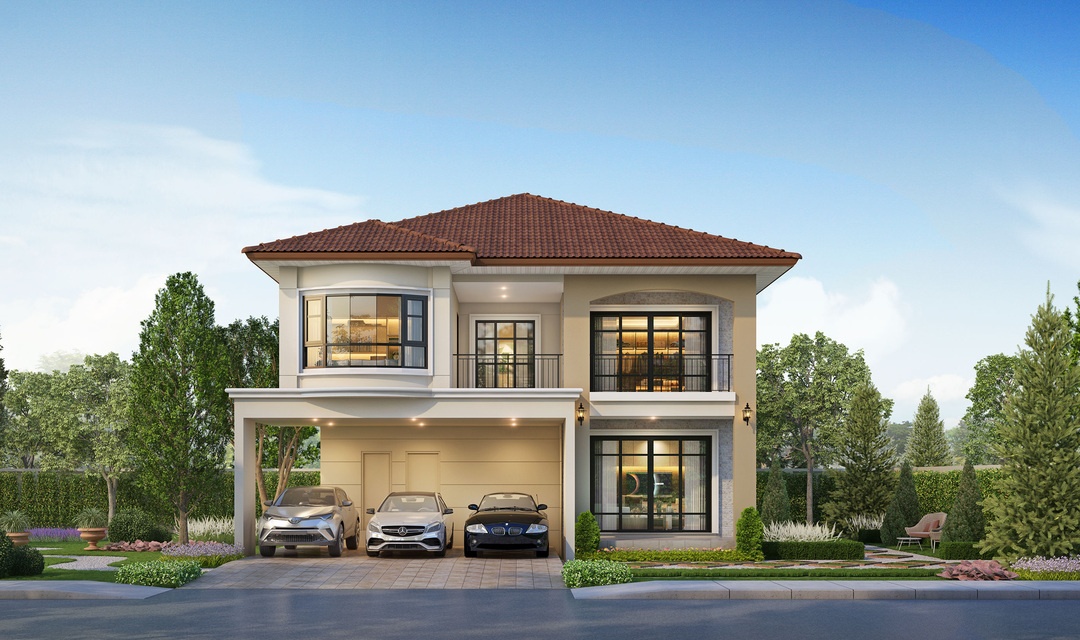 แบบบ้าน : ROSSELLA บ้านเดี่ยว 2 ชั้น พื้นที่ใช้สอย 330 ตร.ม. 4 ห้องนอน 6 ห้องน้ำ พื้นที่ภายในบ้าน มีลักษณะเปิดโล่งต่อเนื่องถึงกันโดยไม่มีผนังกั้น (OPEN PLAN) ทำให้การรับและระบายลม (VENTILATION) เป็นไปอย่างทั่วถึง ภายในบ้านจึงเย็นสบายเหมาะสำหรับการอยู่อาศัยและเพิ่มความพิเศษด้วยช่องแสงเหนือหน้าต่างเพื่อรับแสงสว่างมากขึ้น พื้นที่โถงรวมถึงพื้นที่พักผ่อนชั้นบน ขนาดกว้างพิเศษ ออกแบบโดยไม่ให้มีเสากลางห้องทำให้ดูโล่ง-โอ่โถง เหมาะสำหรับการพักผ่อนและเป็นที่รวมของสมาชิกทุกคน เพื่อกระชับความสัมพันธ์อันดี ภายในครอบครัวพร้อมด้วยระเบียงขนาดใหญ่ เพื่อกรองแสงแดด