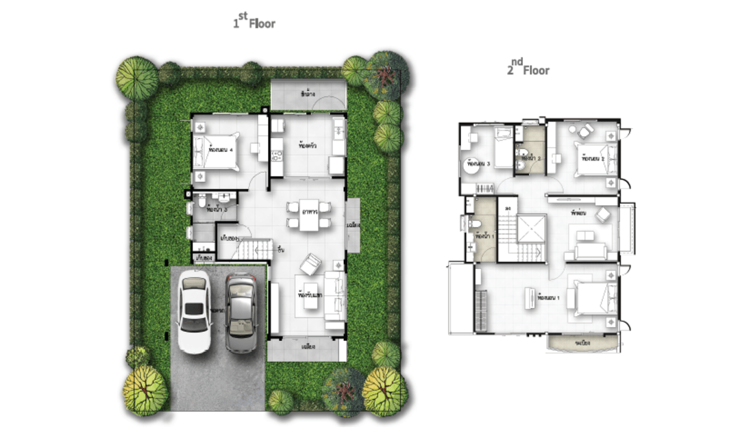 บ้านเดี่ยว 2 ชั้น พื้นที่ใช้สอย 175 ตร.ม. 4 ห้องนอน 3 ห้องน้ำ 1 ส่วนพักผ่อน ที่จอดรถ 2 คัน