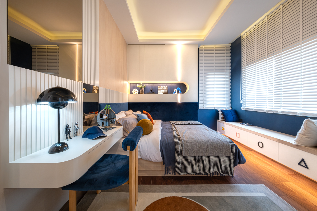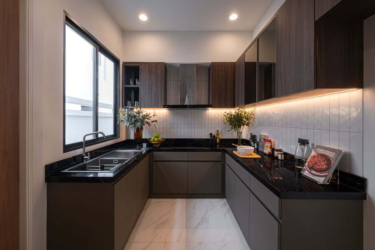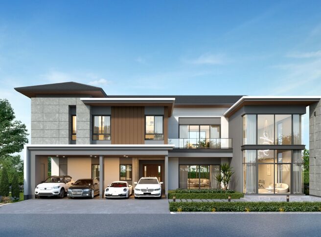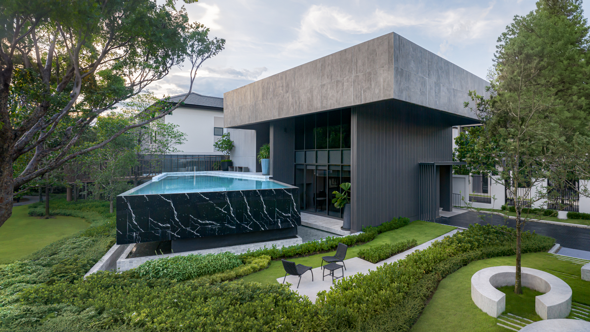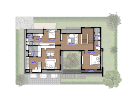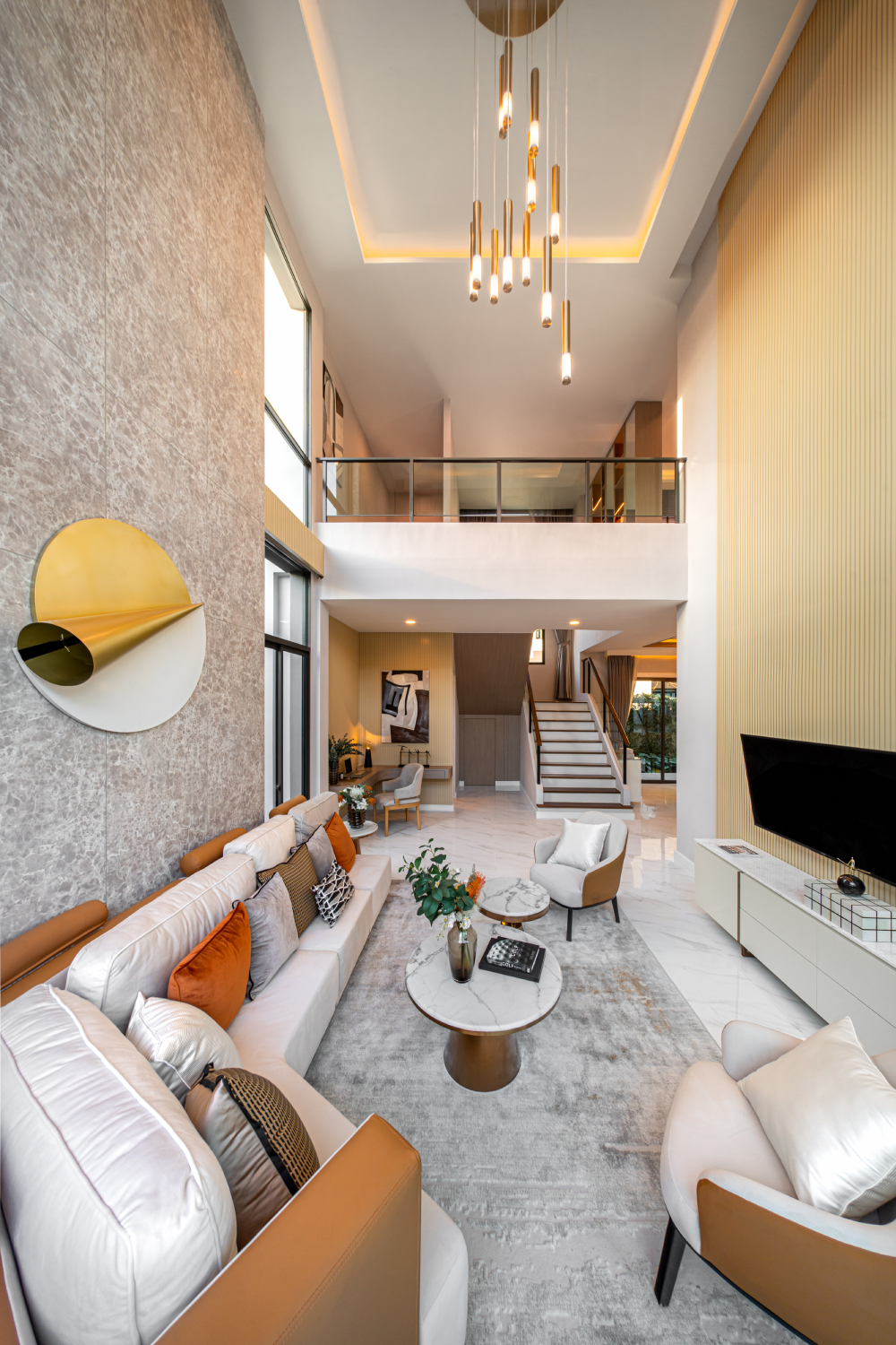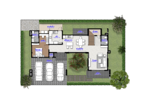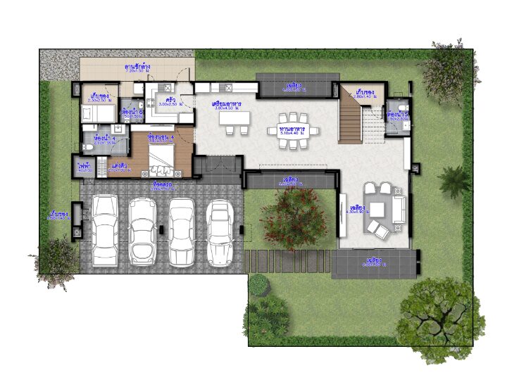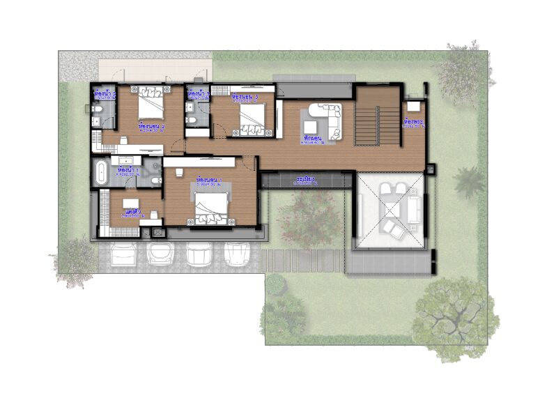 4 ห้องนอน, 5 ห้องน้ำ, 1 มุมพักผ่อน, 1 ห้องครัว พร้อมที่จอดรถ 3 คัน พื้นที่ใช้สอย 327 ตร.ม.