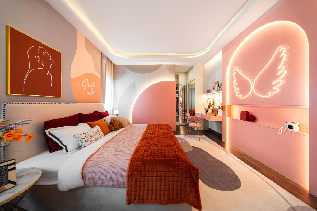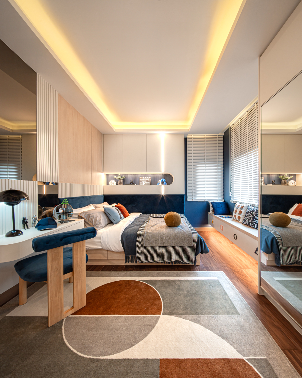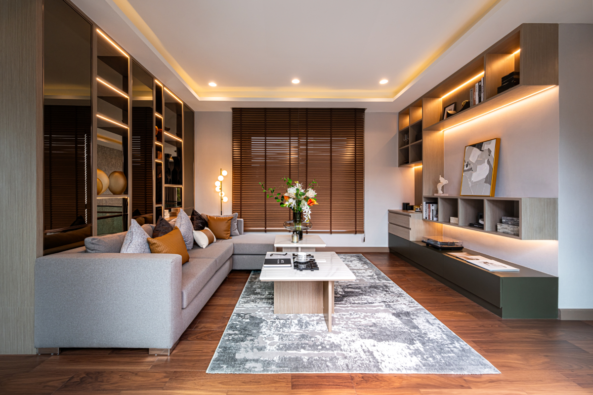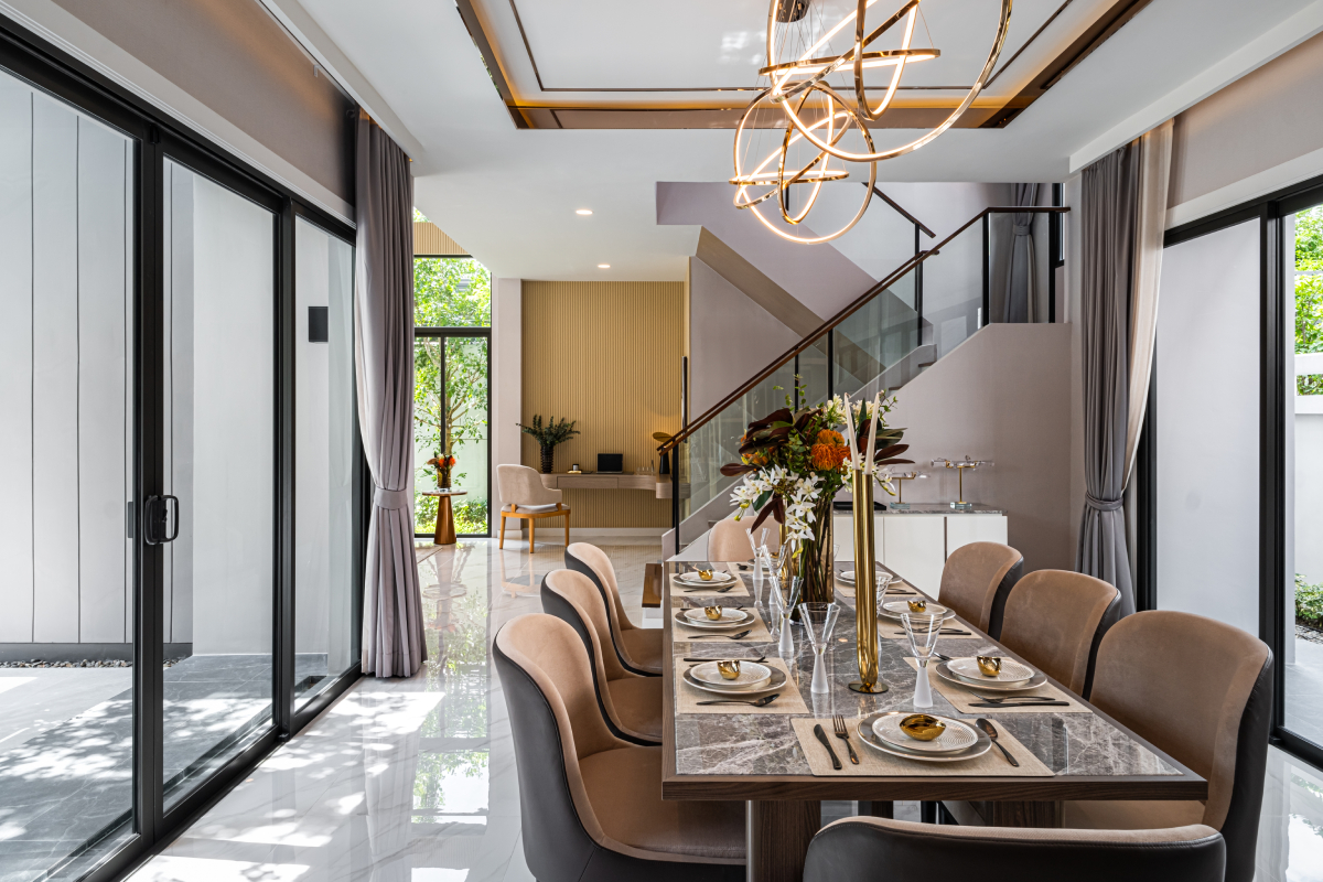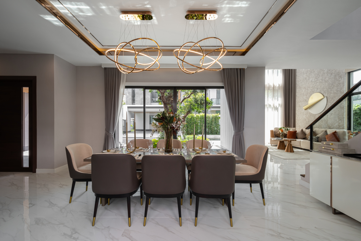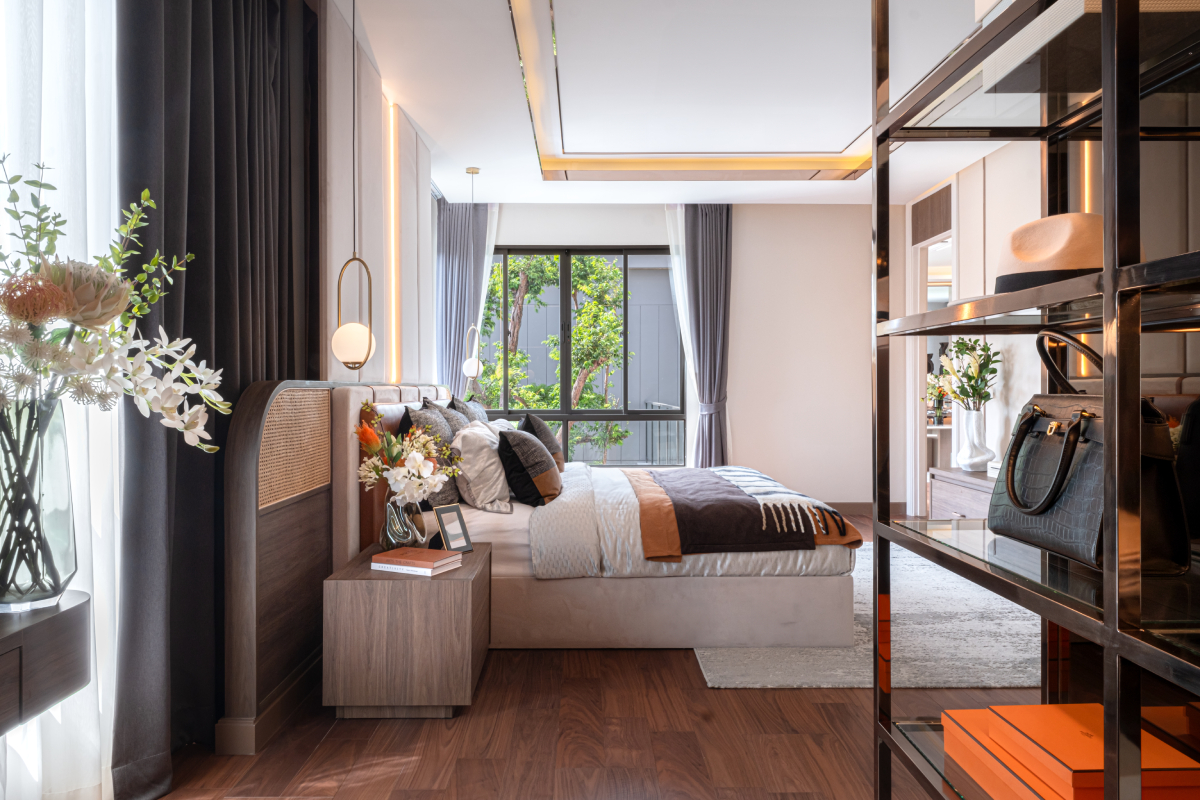 4 ห้องนอน, 6 ห้องน้ำ, 1 มุมพักผ่อน, 1 ห้องครัว, 1 ห้องแม่บ้าน พร้อมที่จอดรถ 4 คัน พื้นที่ใช้สอย 385 ตร.ม.