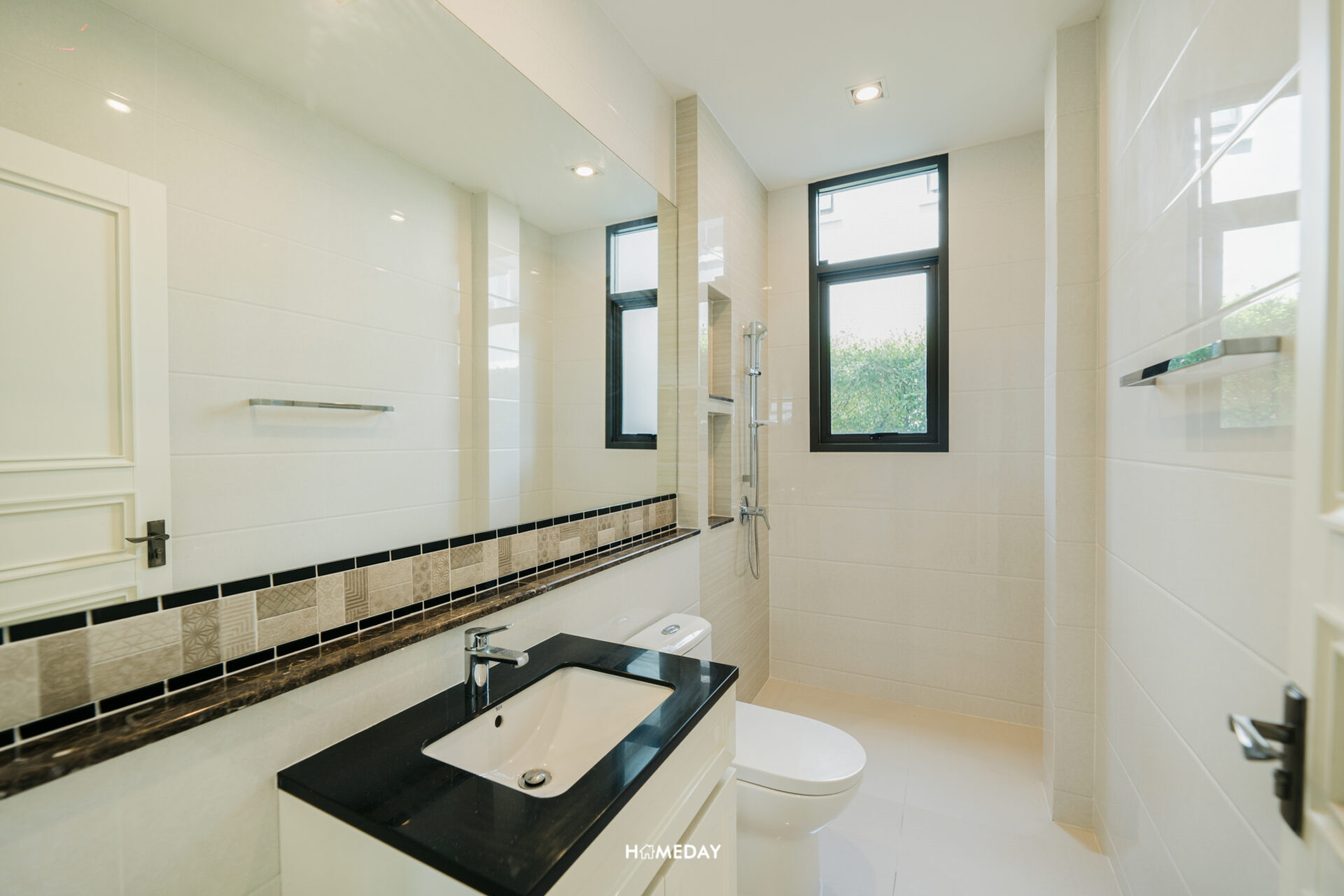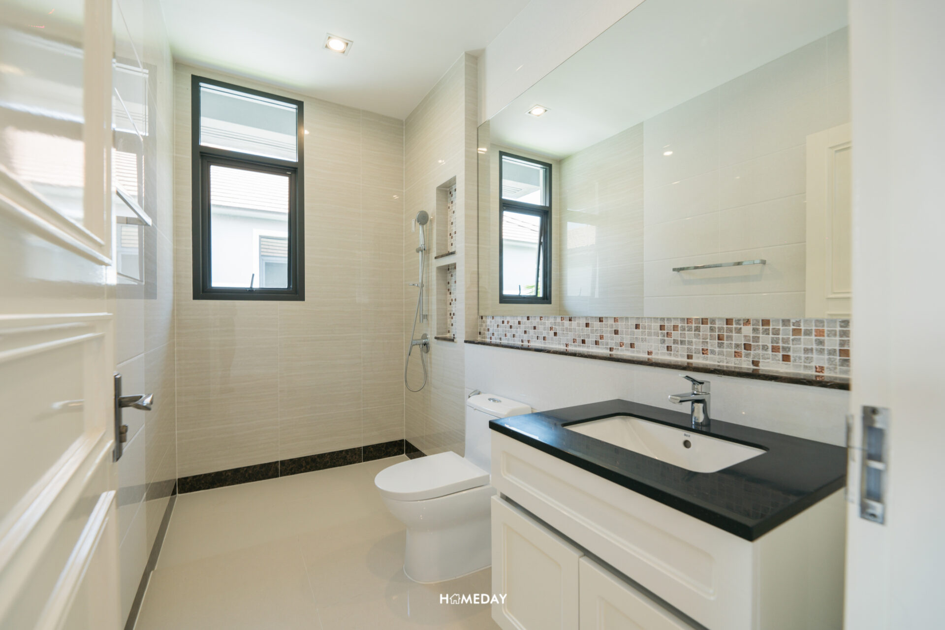 ติดกับครัวจะเป็นห้องน้ำชั้นล่าง ภายในได้ชุดสุขภัณฑ์จาก Kohler และ American Standard พื้นที่ส่วนแห้งประกอบไปด้วยเคาน์เตอร์อ่างล้างหน้าพร้อมตู้เก็บของด้านใต้ ถัดไปเป็นโถสุขภัณฑ์ กระจกได้บานกว้างที่มีความยาวไปถึงด้านหลังโถสุขภัณฑ์เลยครับ นอกจากนี้ยังมี Low Wall ขนาดเท่ากัน สำหรับใช้วางของอีกด้วย ด้านในพื้นที่ส่วนเปียกได้ Hand Shower, Drop Wall สำหรับวางของ และหน้าต่างระบายอากาศมาให้ ซึ่งเราสามารถบิลต์อิน Partition เพื่อกั้นโซนเปียก-แห้งเพิ่มเติมได้เองเลยครับ