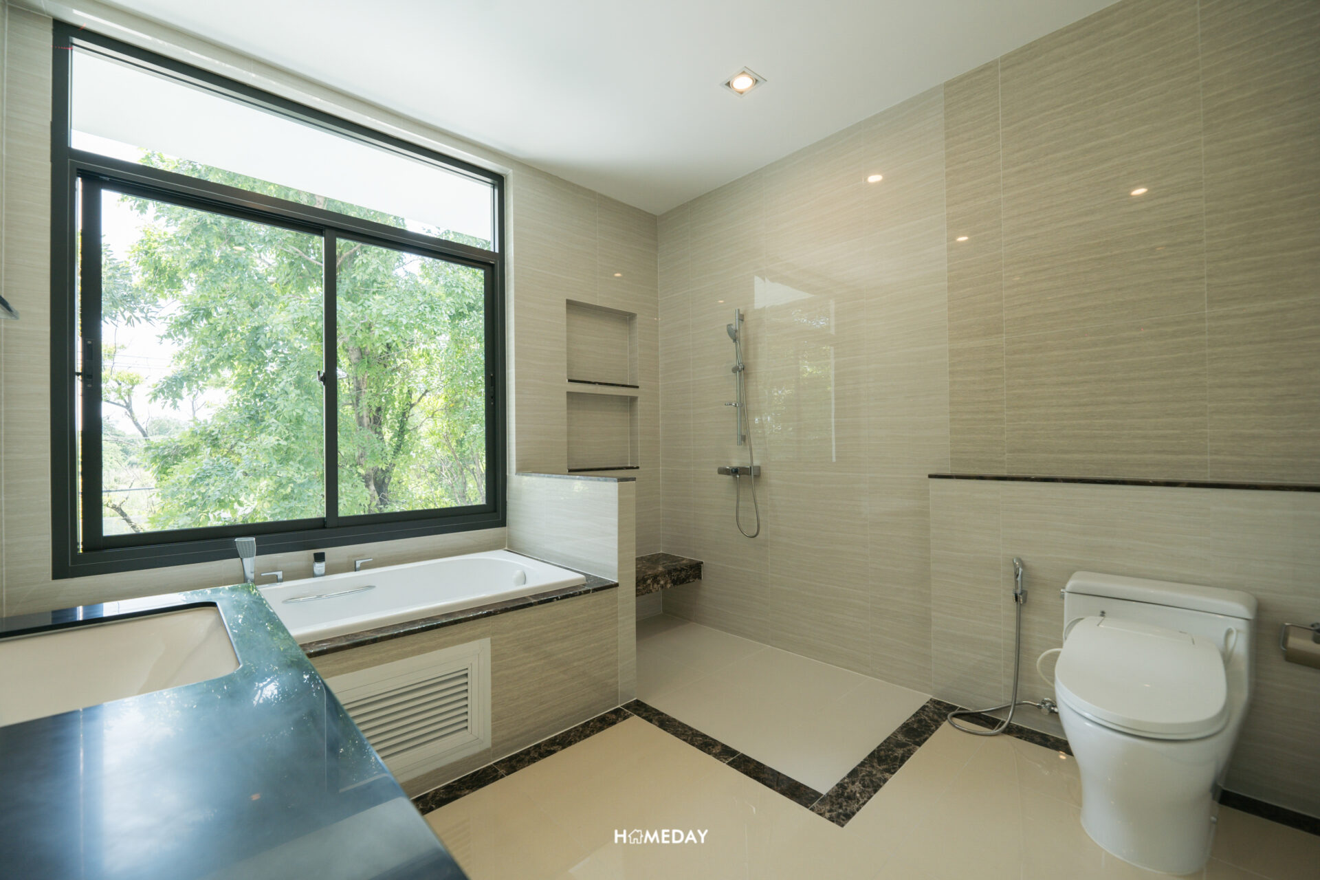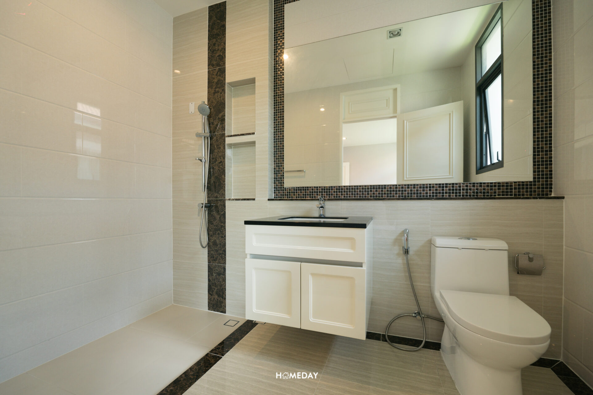 ฝั่งขวามือจากทางเข้าจะเป็นส่วนของ Shower ที่มาพร้อม Hand Shower, ม้านั่ง และ Drop Wall ให้เราไปเพิ่มในส่วน Partition ตามดีไซน์ที่ต้องการได้เองครับ ส่วนสุดท้ายจะเป็นโถสุขภัณฑ์ มาพร้อมสายชำระและแกนใส่กระดาษชำระวัสดุคุณภาพ ด้านหลังบิลต์เป็น Low Wall เอาไว้ให้ ใช้วางเครื่องหอมหรือสเปรย์ปรับอากาศได้เลยครับ