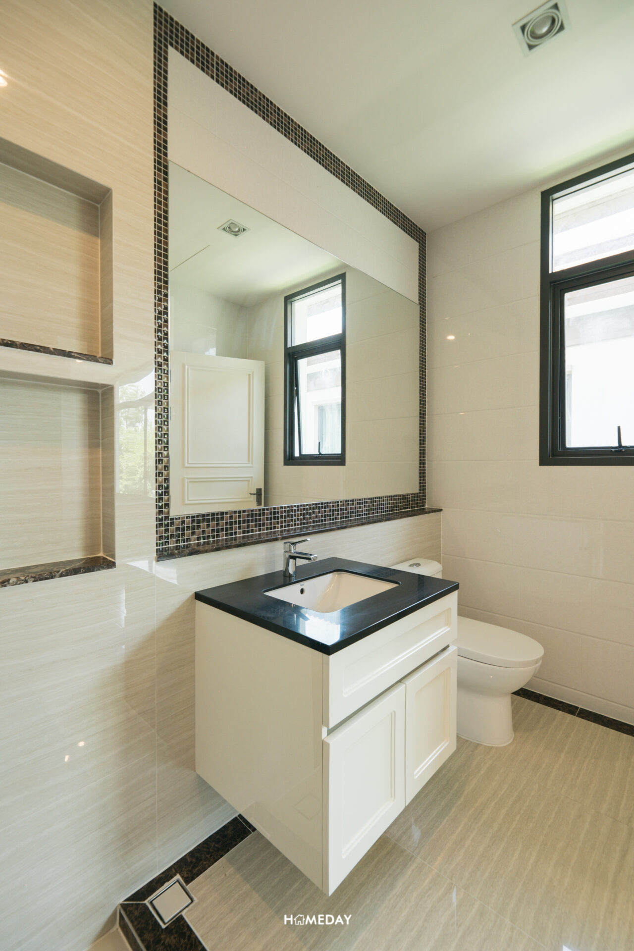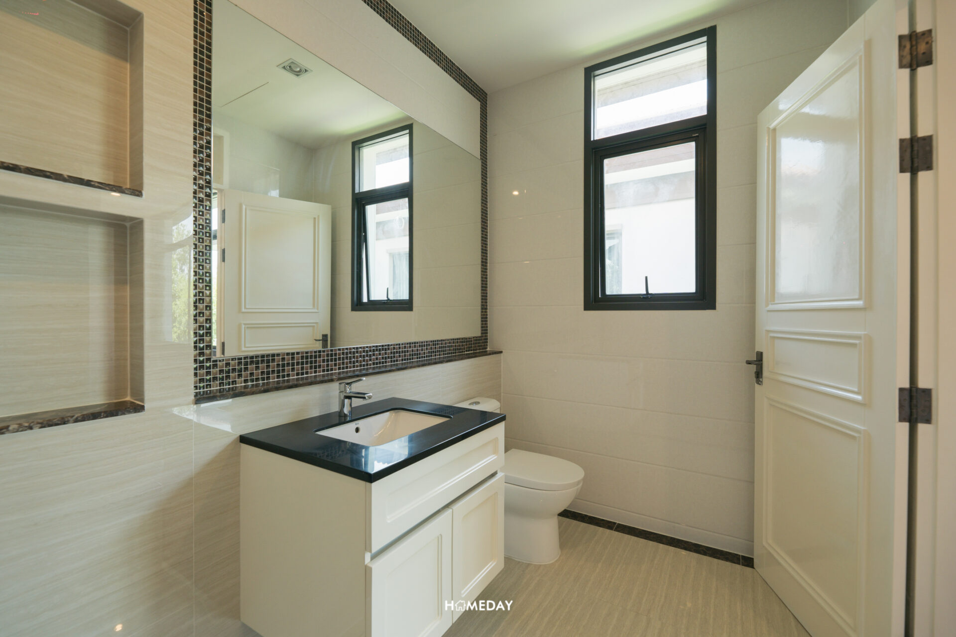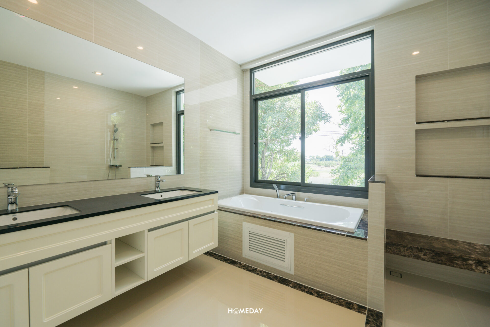 ด้านใน Master Bathroom ใส่ฟังก์ชันการใช้งานสำหรับ 2 ท่านมาให้จัดเต็ม โอ่โถงมาก ๆ ซ้ายมือจากทางเข้าจะเป็นอ่างล้างหน้า His and Her พร้อมบานกระจกกว้าง ด้านใต้ใส่พื้นที่เก็บของขนาดใหญ่มาให้แยกจากกัน เพื่อความเป็นส่วนตัวและระเบียบเรียบร้อยในการจัดเก็บ สามารถใช้งานในช่วงเวลาเร่งรีบยามเช้าพร้อม ๆ กันได้เลยครับ ถัดเข้าไปติดกันจะเป็นอ่างอาบน้ำครับ อยู่ติดกับบานหน้าต่างขนาดใหญ่รับวิวด้านนอกสุดชิล
