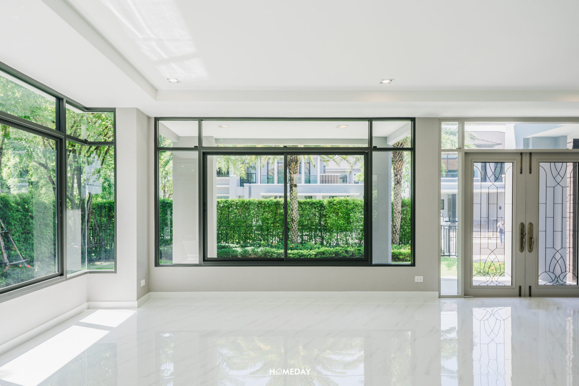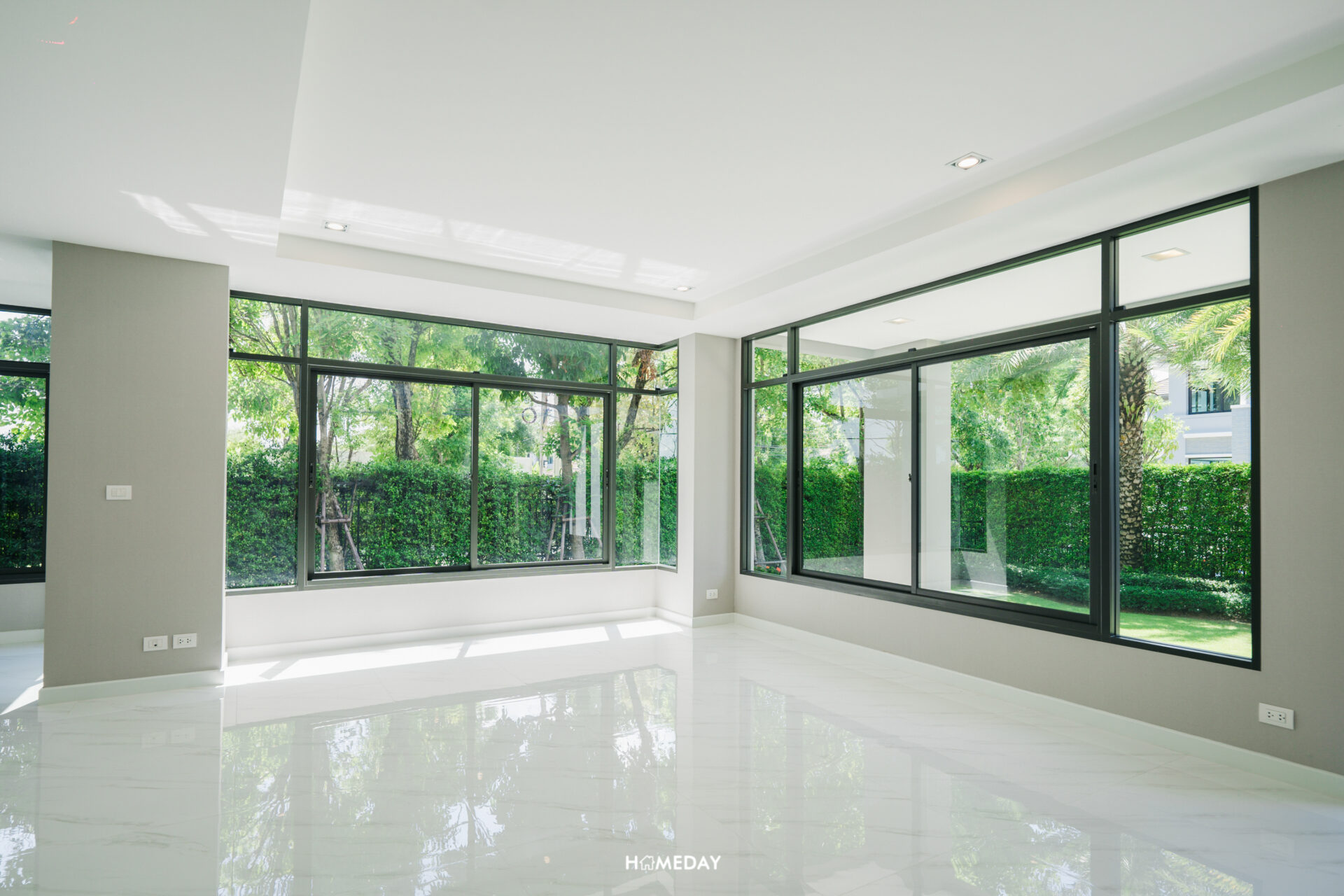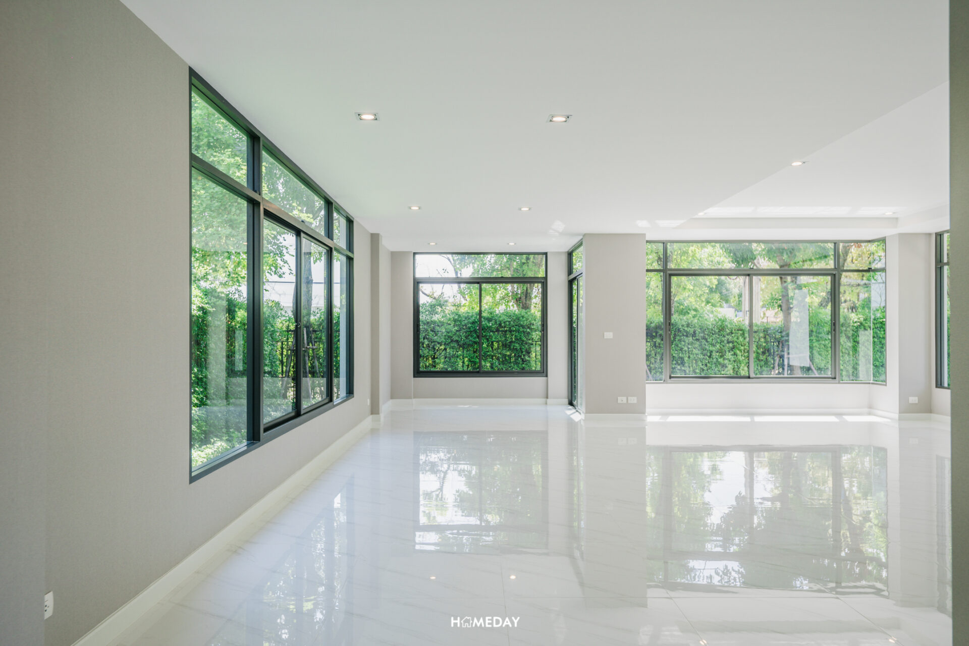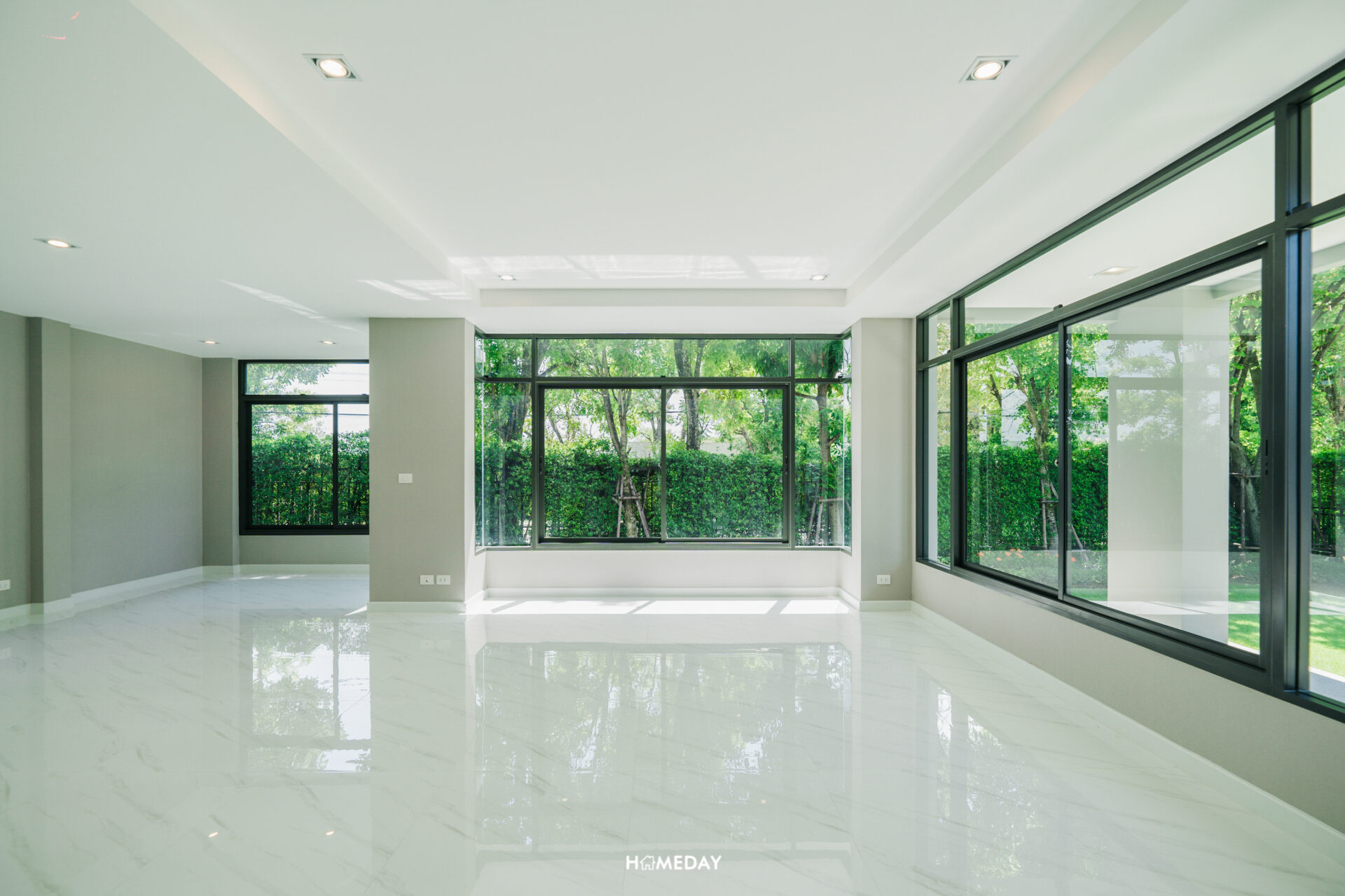 พื้นที่ด้านใน เปิดเข้ามาก็จะเจอกับโถง Open Space โล่ง ๆ แบบนี้เลยครับ สังเกตได้ว่ากระจกติดตั้งไว้รอบทิศทางเลย บานใหญ่จัดเต็มมาก ๆ รับวิวสวนด้านนอกได้ทุกมุมเลย แถมยังช่วยเพิ่มความโปร่งให้กับบ้านได้มากยิ่งขึ้นอีกด้วย เพดานได้ฝ้าดรอปพร้อมไฟดาวน์ไลท์สวยงามครับ
