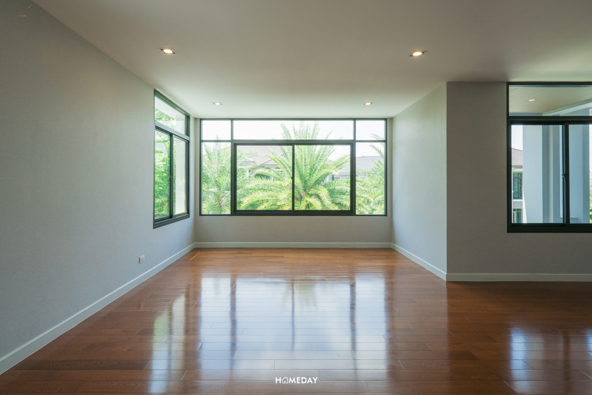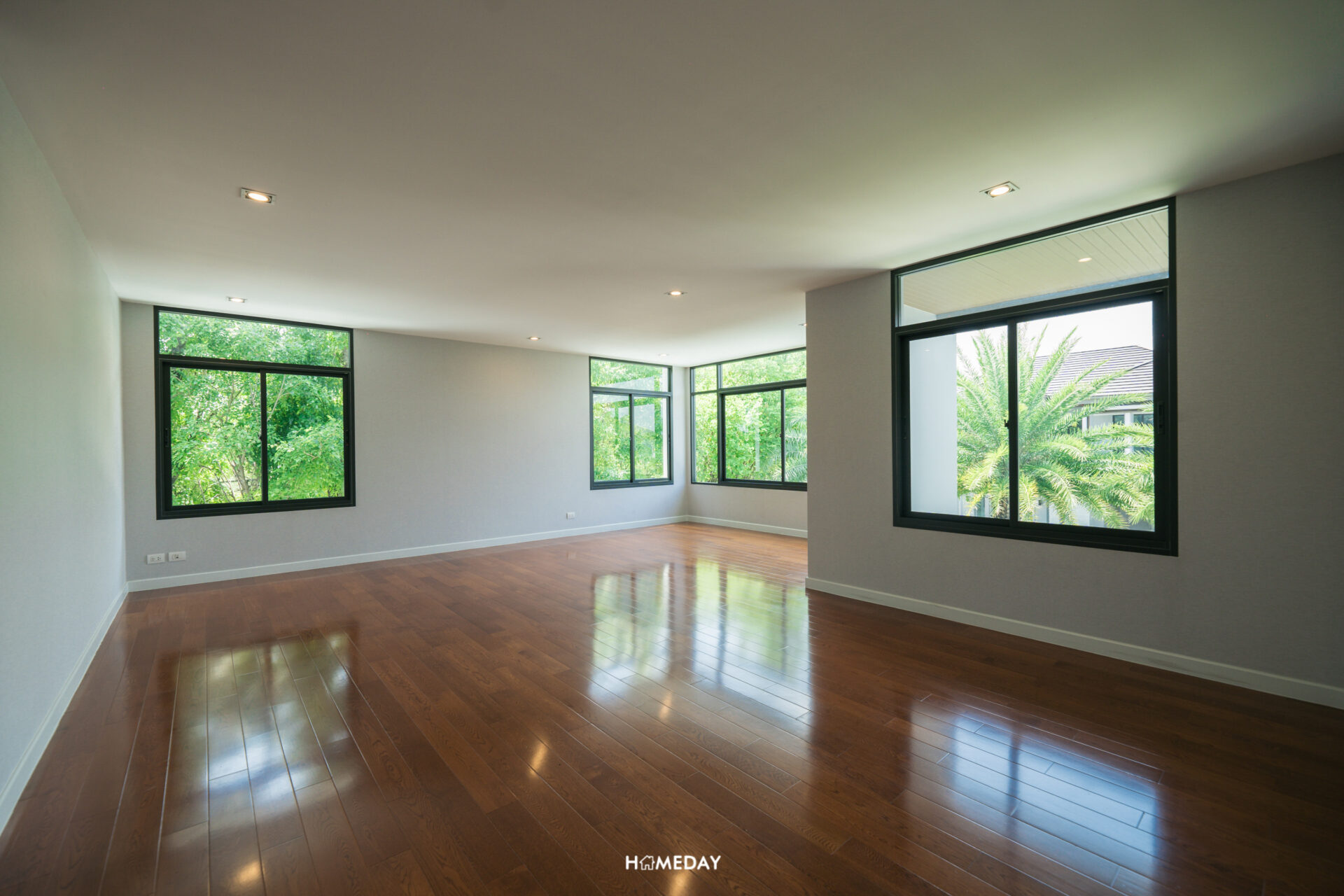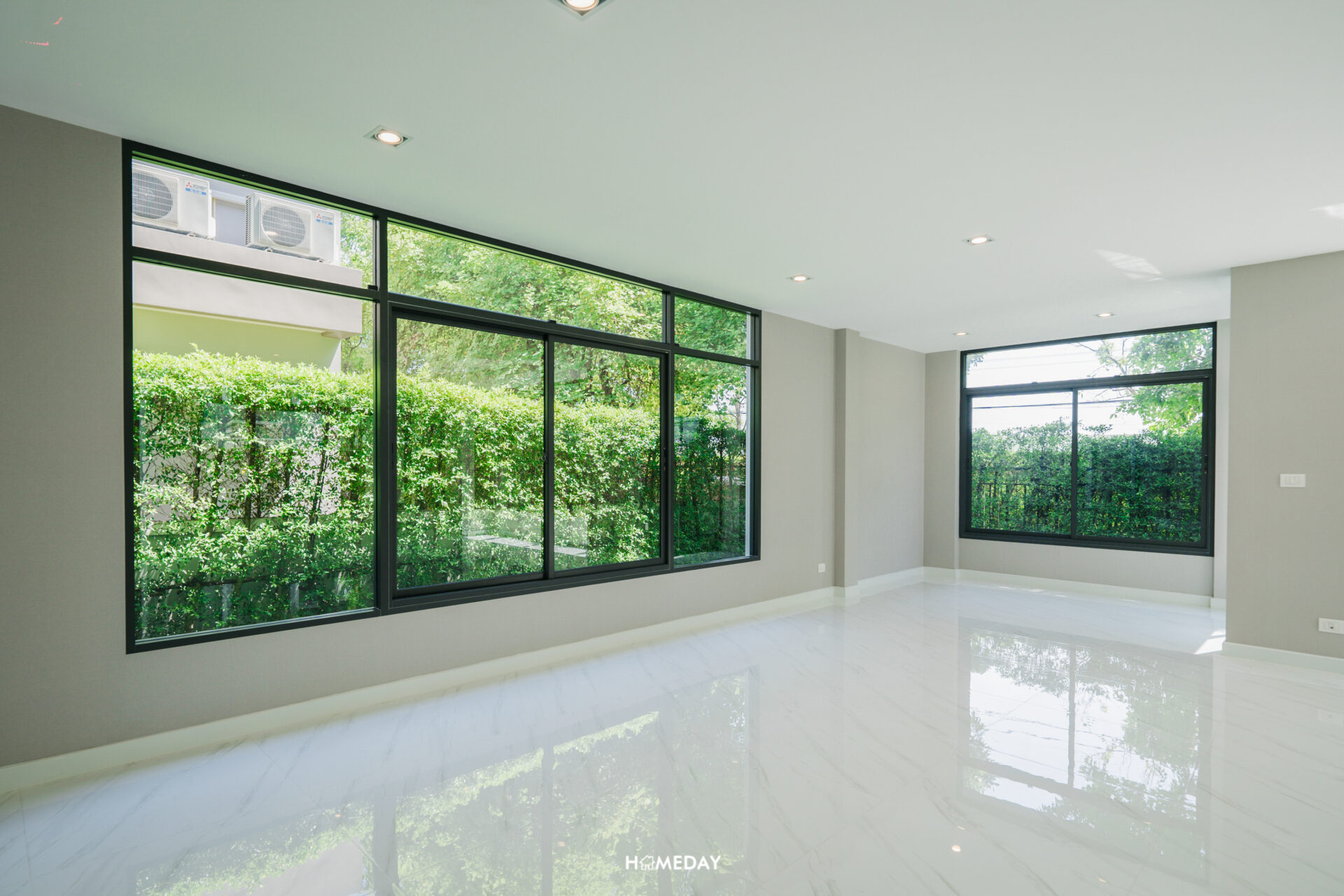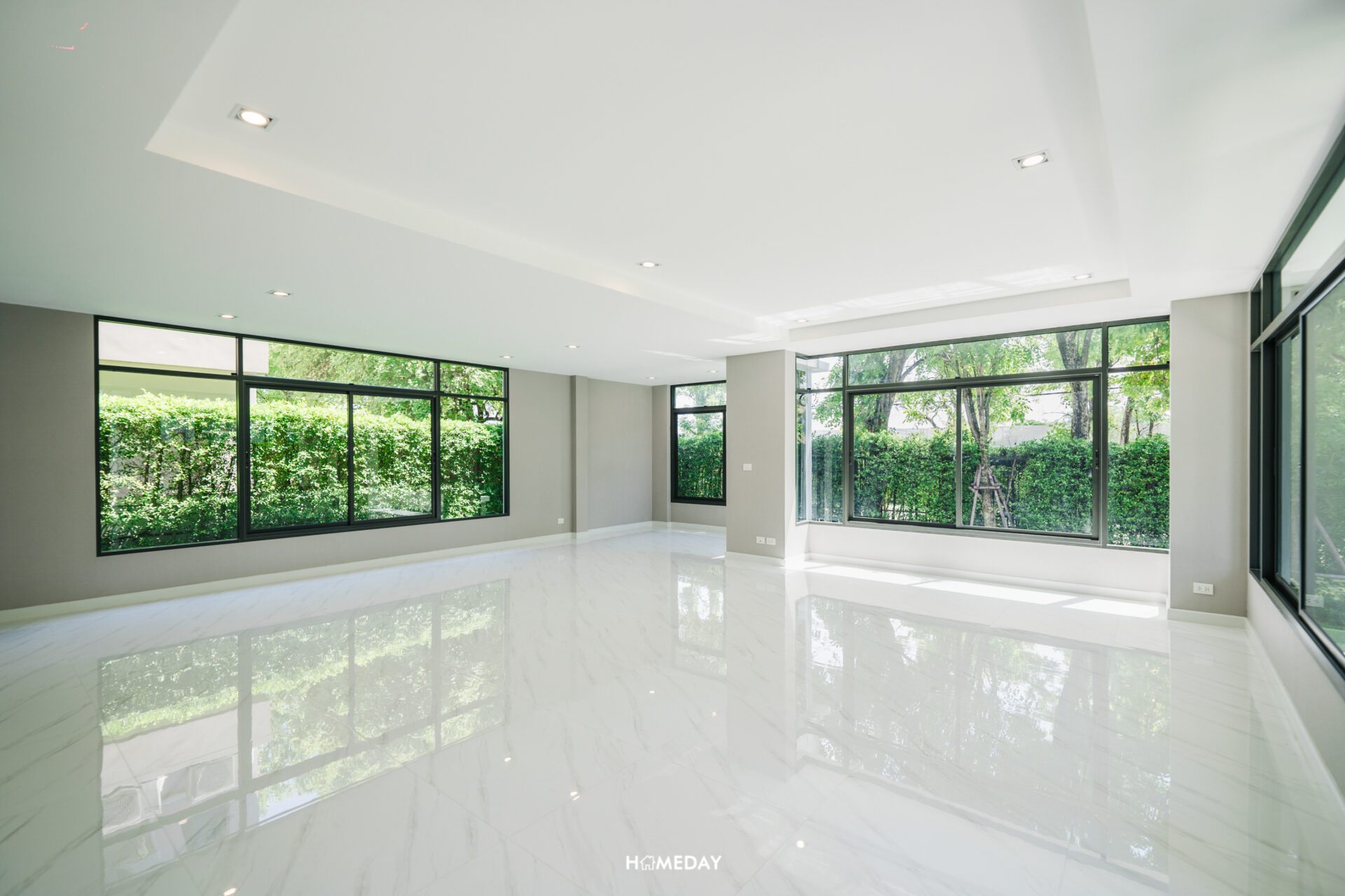 พื้นที่ด้านใน เปิดเข้ามาก็จะเจอกับโถง Open Space โล่ง ๆ แบบนี้เลยครับ สังเกตได้ว่ากระจกติดตั้งไว้รอบทิศทางเลย บานใหญ่จัดเต็มมาก ๆ รับวิวสวนด้านนอกได้ทุกมุมเลย แถมยังช่วยเพิ่มความโปร่งให้กับบ้านได้มากยิ่งขึ้นอีกด้วย เพดานได้ฝ้าดรอปพร้อมไฟดาวน์ไลท์สวยงามครับ