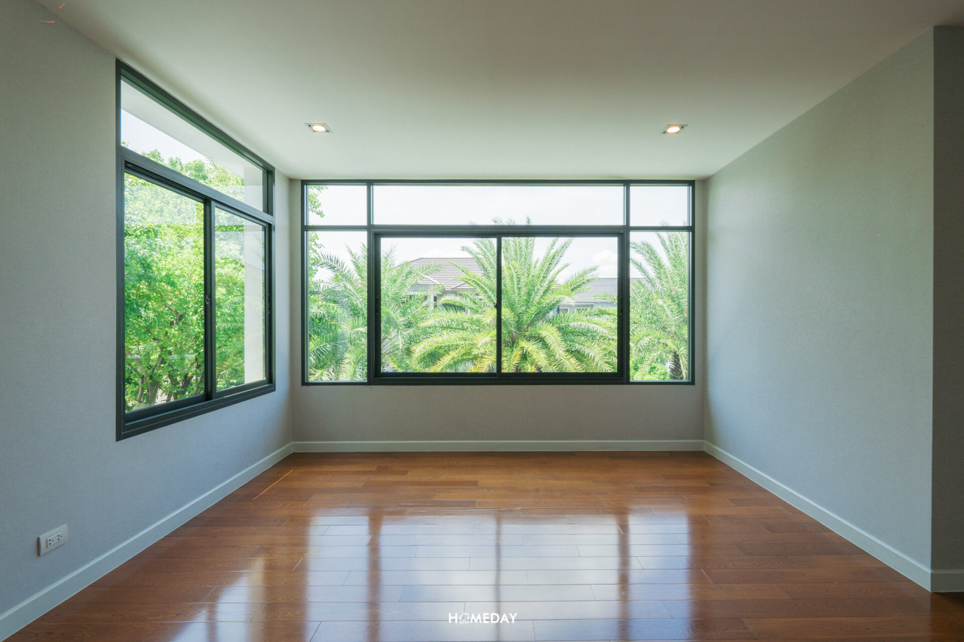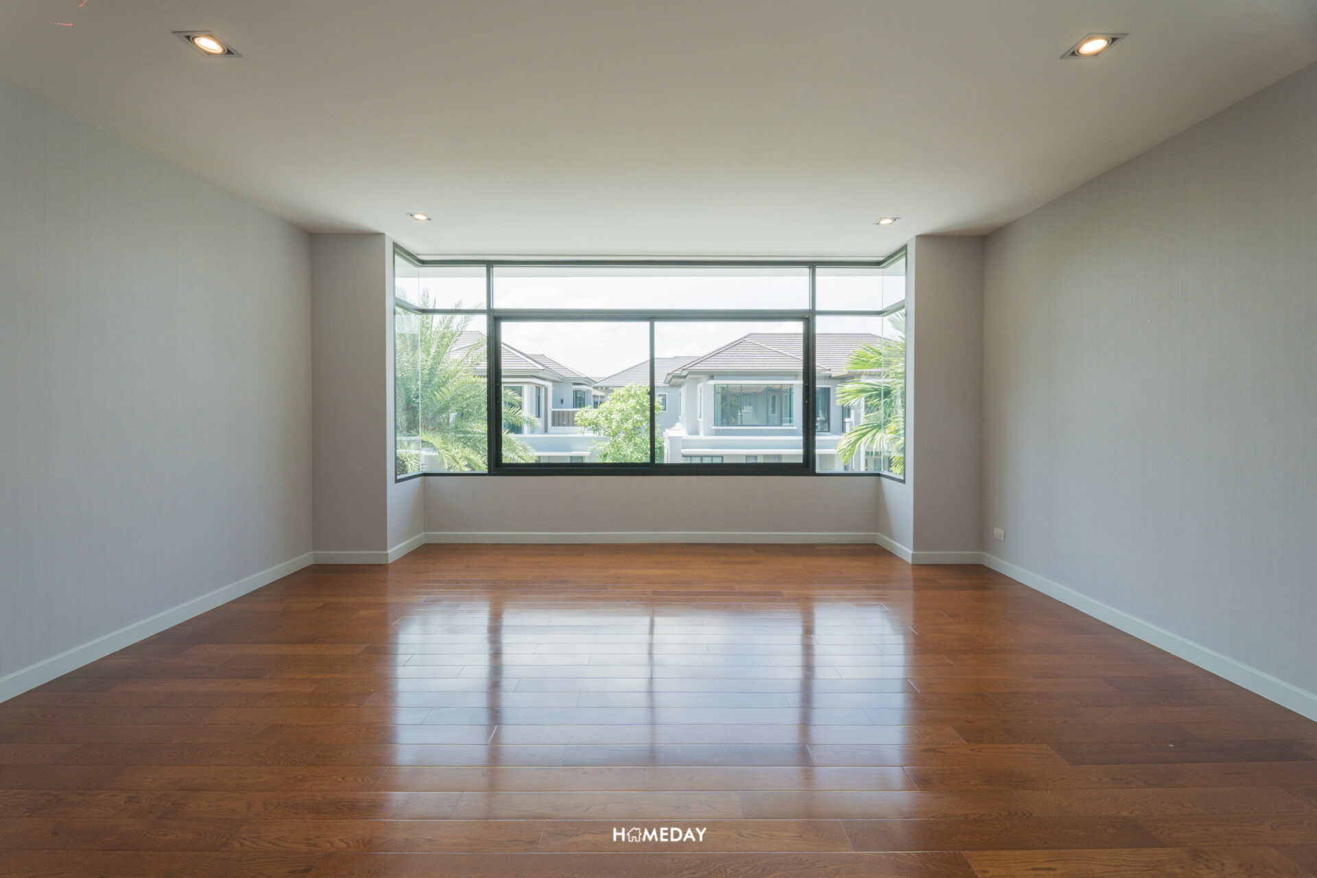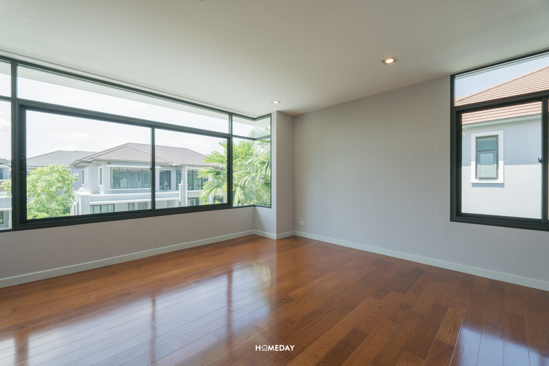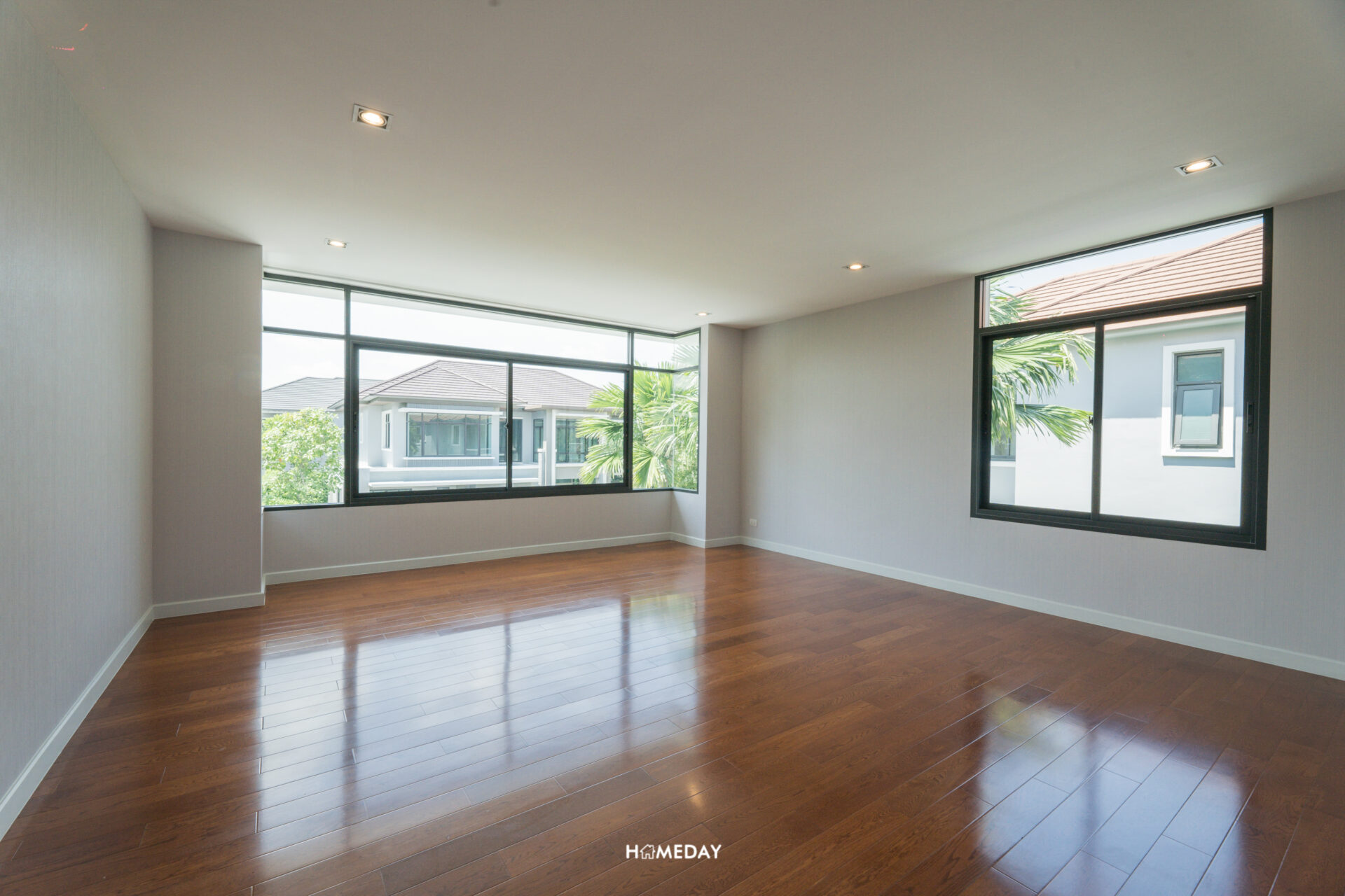 พื้นที่ด้านใน เปิดเข้ามาก็จะเจอกับโถง Open Space โล่ง ๆ แบบนี้เลยครับ สังเกตได้ว่ากระจกติดตั้งไว้รอบทิศทางเลย บานใหญ่จัดเต็มมาก ๆ รับวิวสวนด้านนอกได้ทุกมุมเลย แถมยังช่วยเพิ่มความโปร่งให้กับบ้านได้มากยิ่งขึ้นอีกด้วย เพดานได้ฝ้าดรอปพร้อมไฟดาวน์ไลท์สวยงามครับ