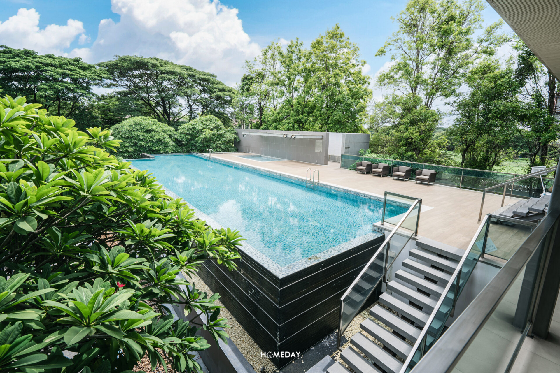 Sky View Swimming Pool สระว่ายน้ำระบบเกลือ ท่ามกลางแมกไม้ธรรมชาติ ตัวสระมีขนาดใหญ่ รองรับการใช้งานได้ทั้งการว่ายออกกำลังกายและการว่ายพักผ่อน มีสระเด็กแยกออกมาเพื่อความปลอดภัยในการใช้งาน มาพร้อมพื้นที่นั่งเล่นริมสระครับ