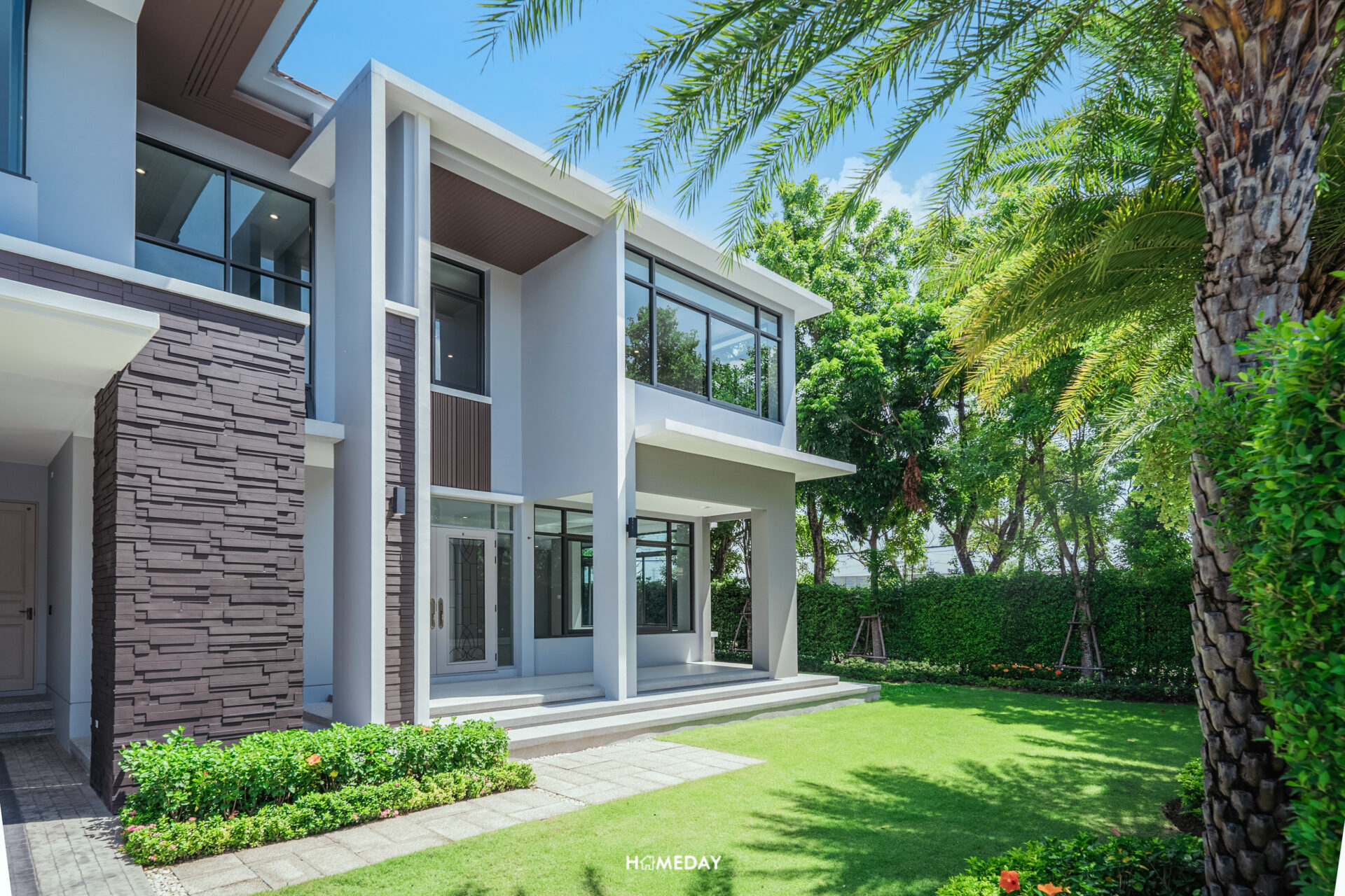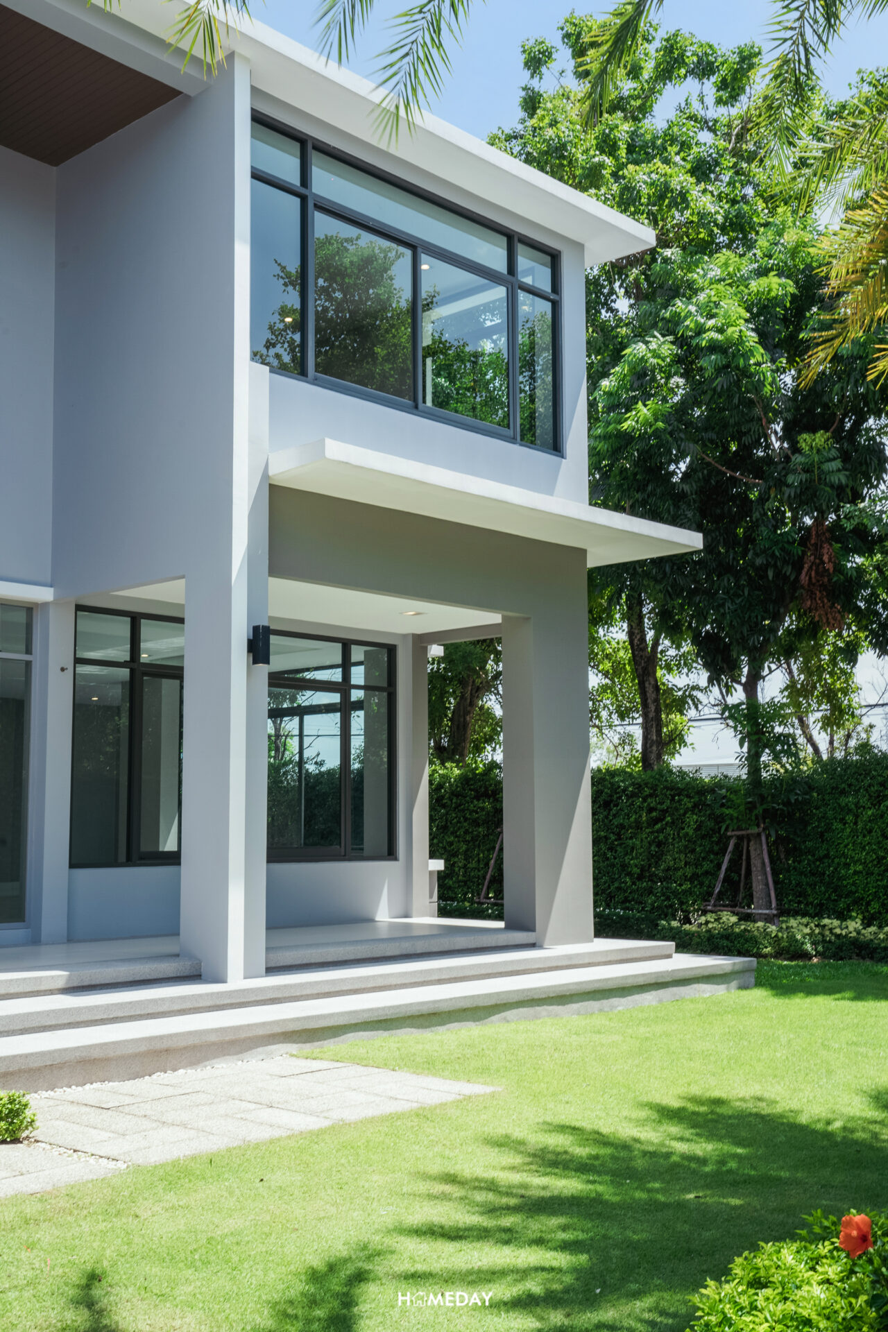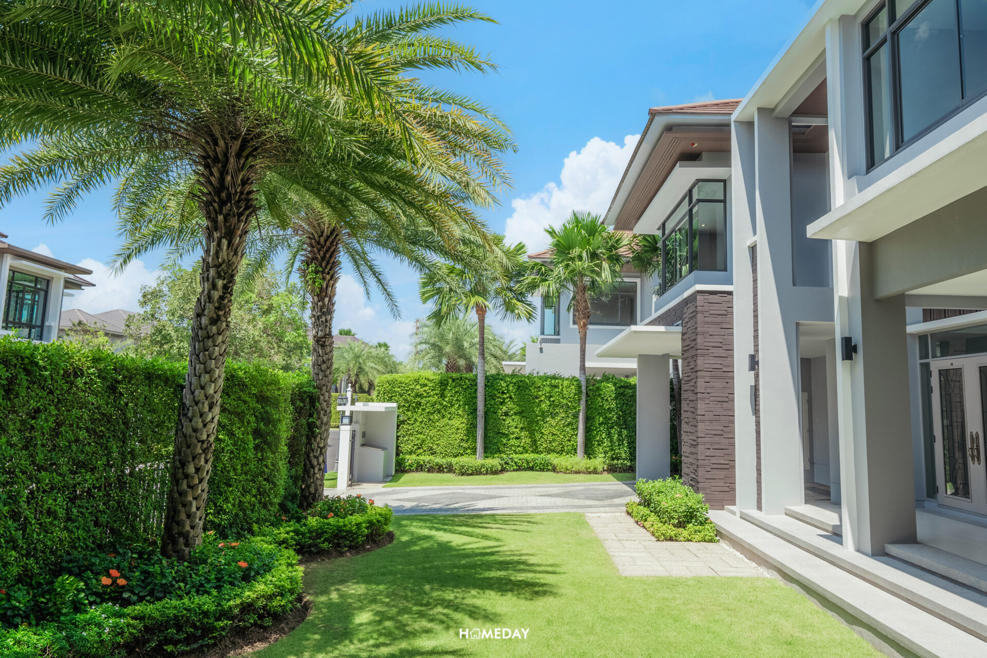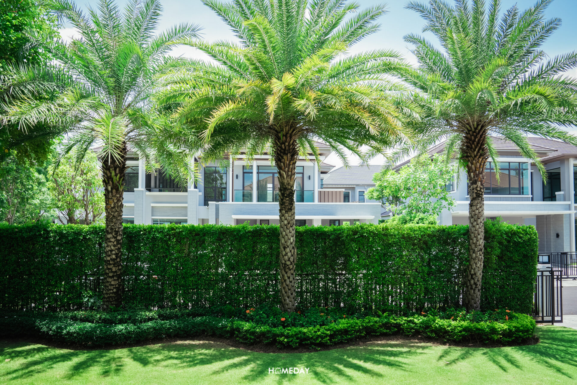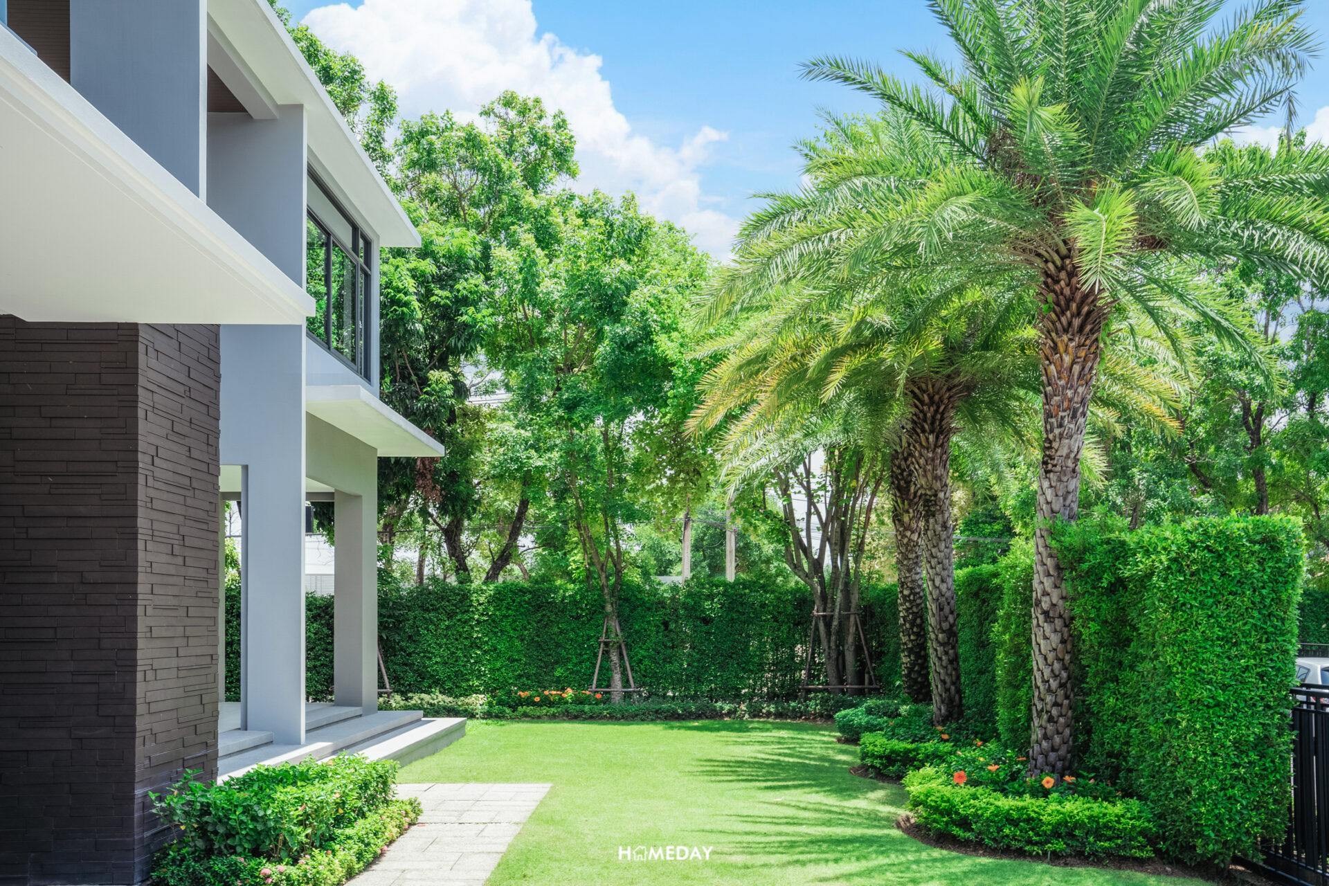 สวนของบ้านหลังนี้ ทางโครงการจัดสวนตกแต่งเอาไว้ให้อย่างสวยงาม รอบรั้วได้ไม้พุ่มล้อม ปิดบังการมองเห็นจากภายนอกเพื่อยกระดับความเป็นส่วนตัวของผู้อาศัย รอบรั้วบ้านได้ต้นไม้ใหญ่ล้อม ปลูกเรียงกันสวยงามให้ทั้งบรรยากาศและร่มเงา โดยสามารถมองเห็นไม้ประดับได้ในทุกจุด สดชื่นสบายตา พื้นที่สวนหน้าบ้านยังเหลือให้ใช้งานเยอะพอสมควร สามารถจัดวางโต๊ะเก้าอี้สนามหรือชิงช้าสำหรับนั่งเล่นพักผ่อนเพิ่มได้สบาย ๆ เลยครับ