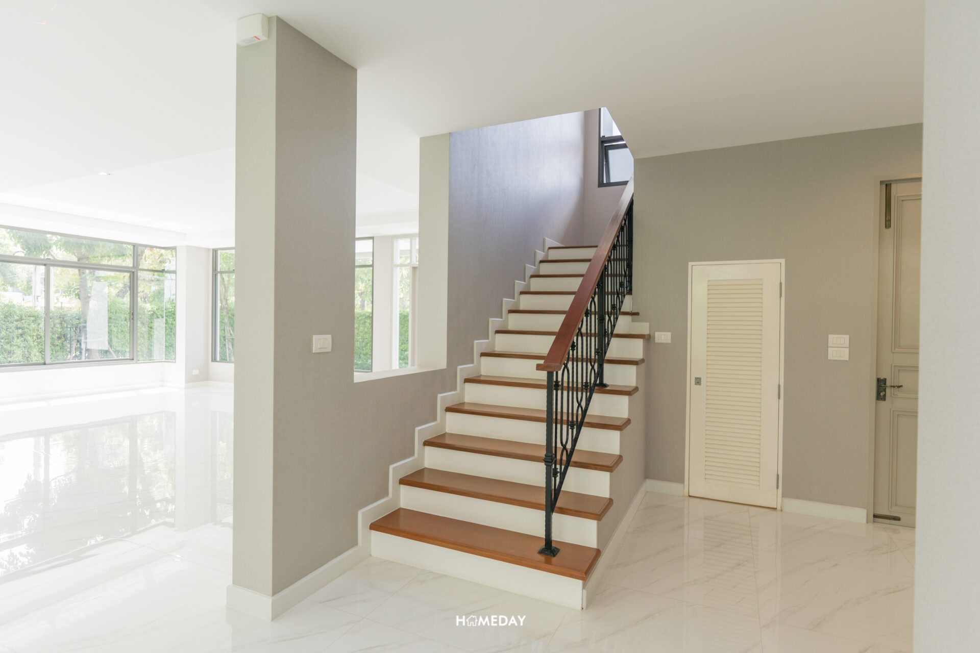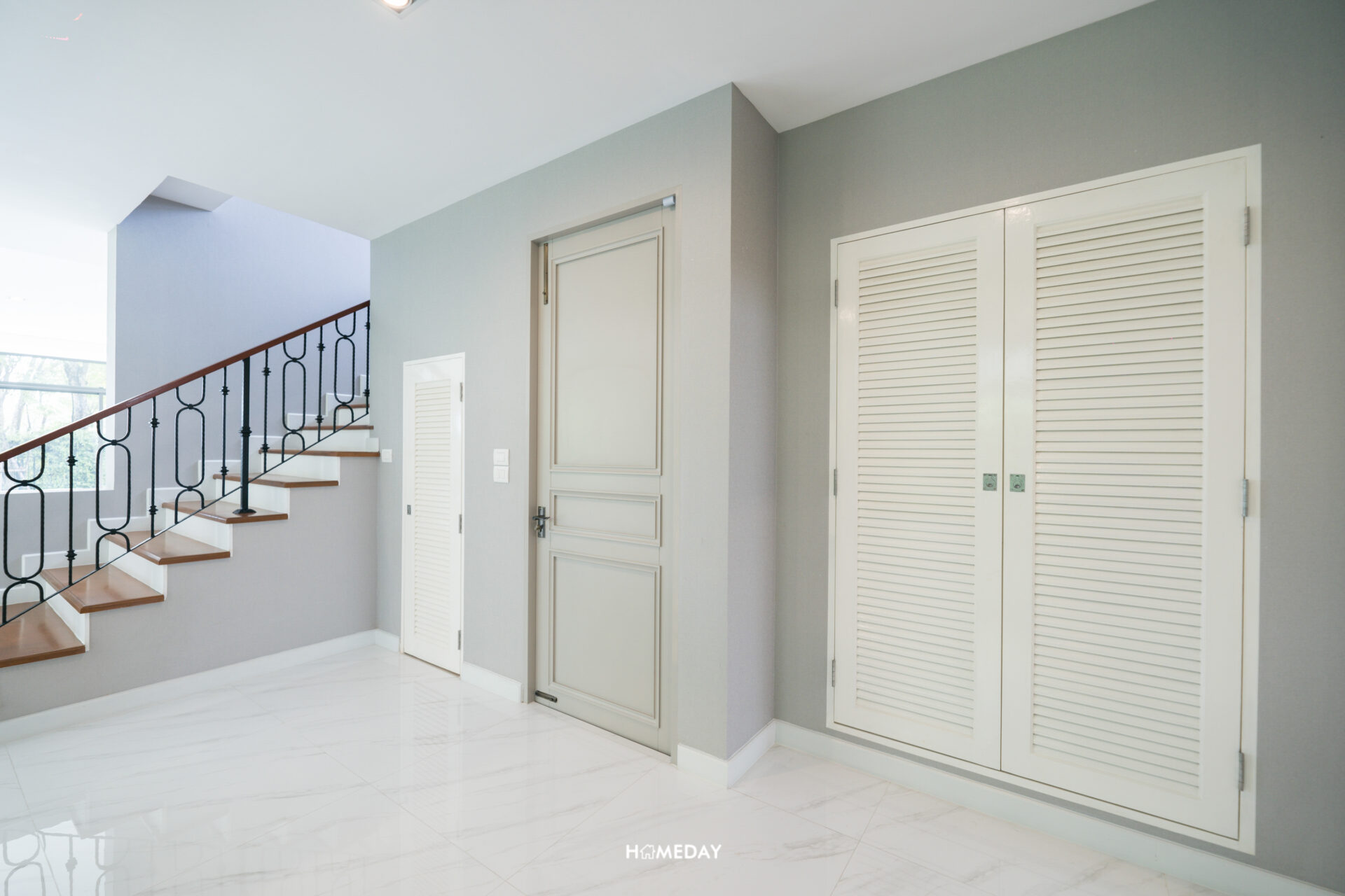มาดูพื้นที่ทางด้านซ้ายจากทางเข้ากันบ้างดีกว่าครับ ตรงนี้จะเป็นบันไดทางขึ้นชั้น 2 กั้นด้วยกำแพงไว้ให้เพื่อความเป็นสัดส่วนและความเป็นส่วนตัว มีช่องว่างสำหรับบิลต์อินเพิ่มเป็นตู้เก็บของหรือชั้นวางของก็ได้ครับ