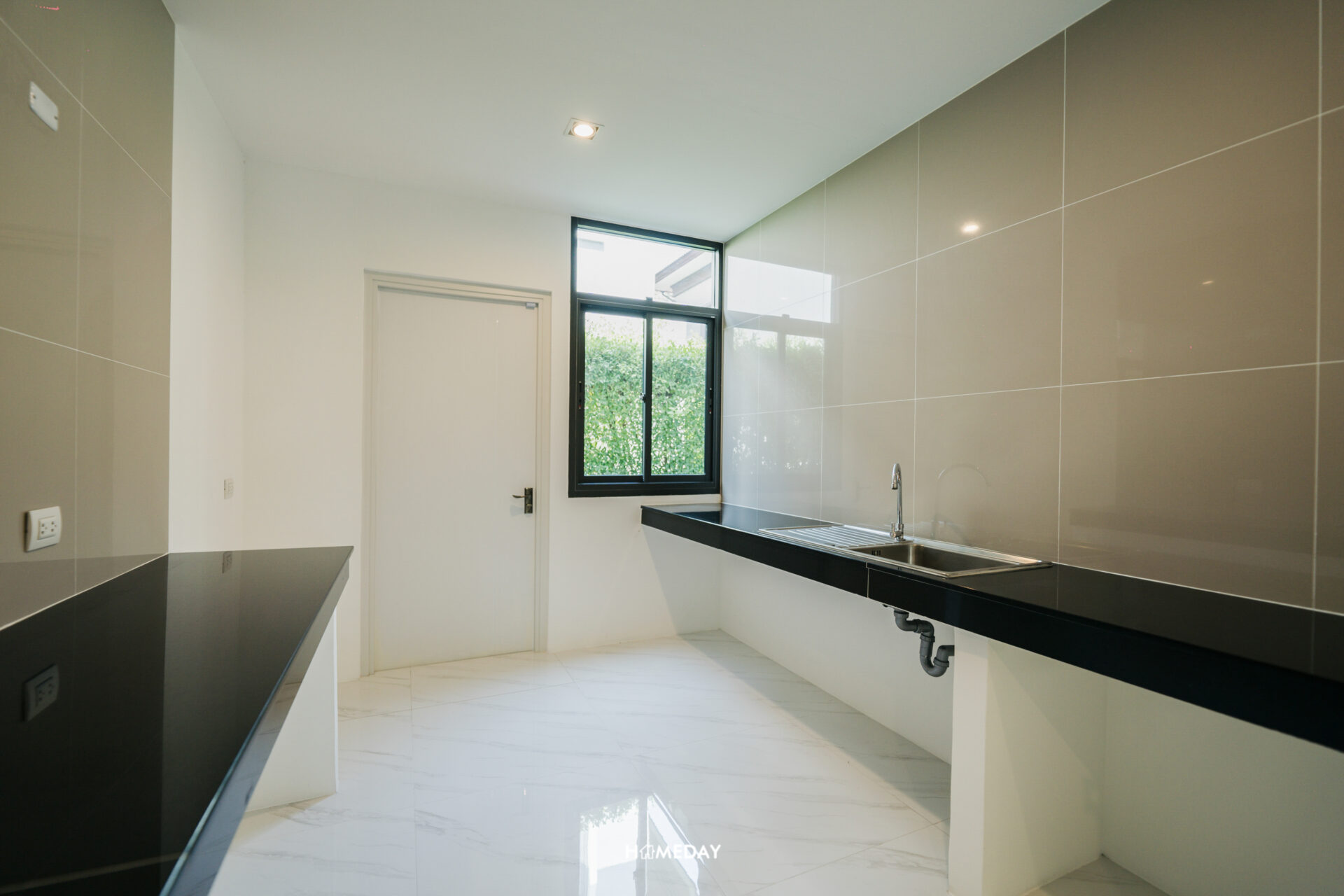 ถัดจากห้องอเนกประสงค์ ติดกันจะเป็นครัวไทยระบบปิดอย่างดีครับ ด้านในทางโครงการบิลต์อินเคาน์เตอร์ครัวมาให้สองฝั่งพร้อมซิงก์ล้างจาน เว้นช่องสำหรับวางตู้เย็นเอาไว้ให้เรียบร้อย ผนังกรุเป็นกระเบื้อง Backsplash เพื่อให้สามารถเช็ดล้างทำความสะอาดคราบมันได้ง่าย เราสามารถบิลต์ตู้แขวนผนังรวมไปถึงบานตู้ใต้เคาน์เตอร์สำหรับเก็บของเพิ่มเติมได้เองตามดีไซน์ที่ชอบเลยครับ