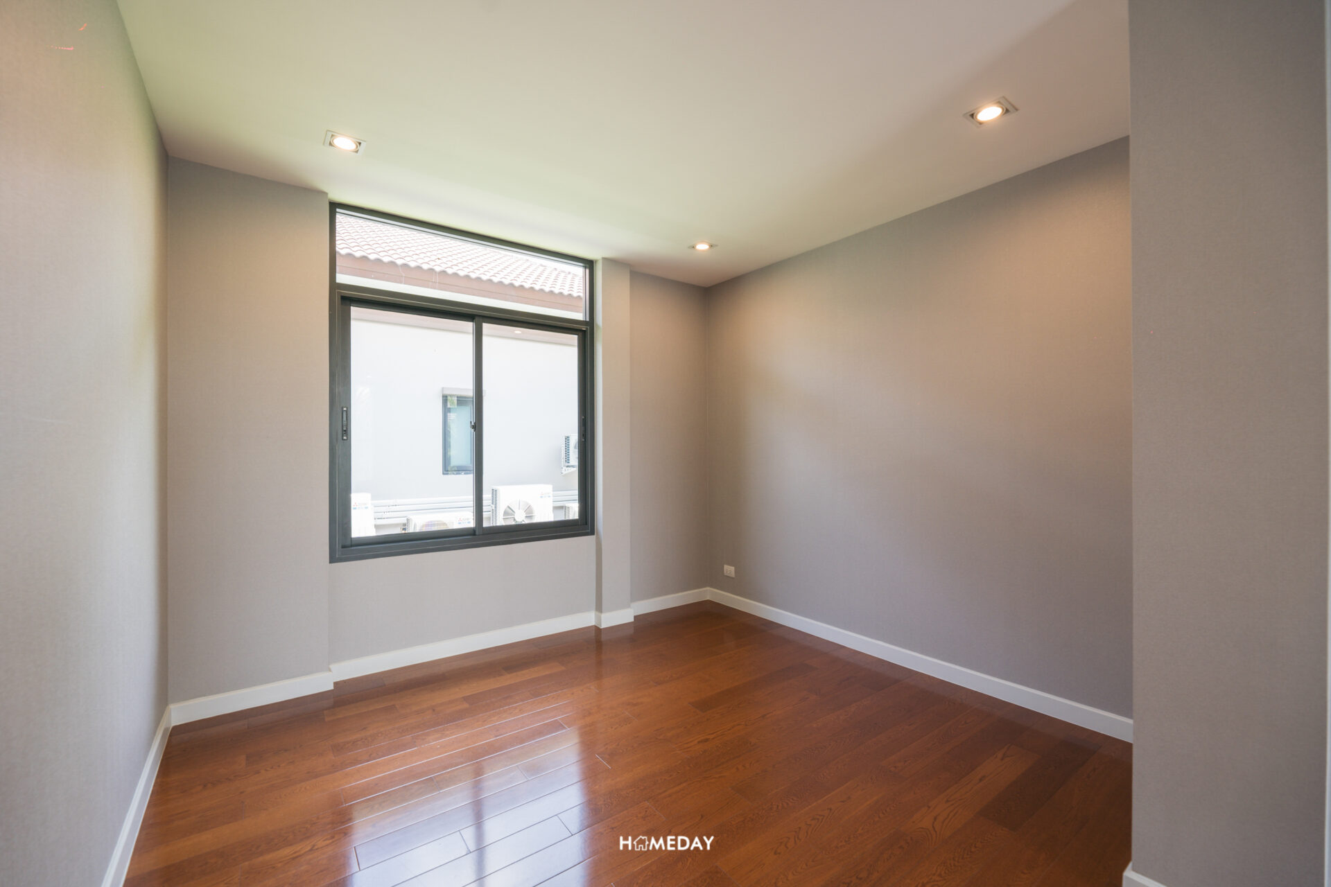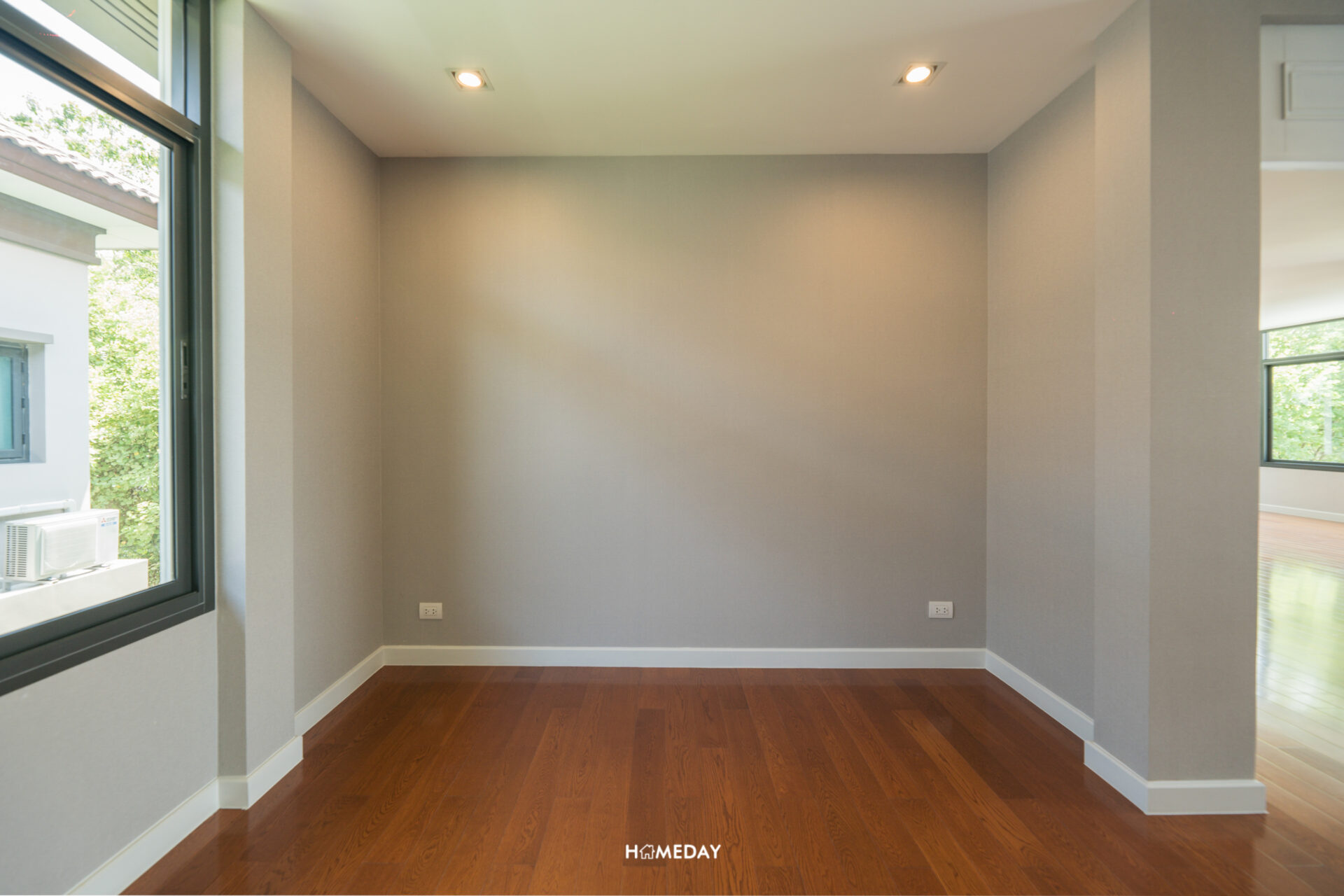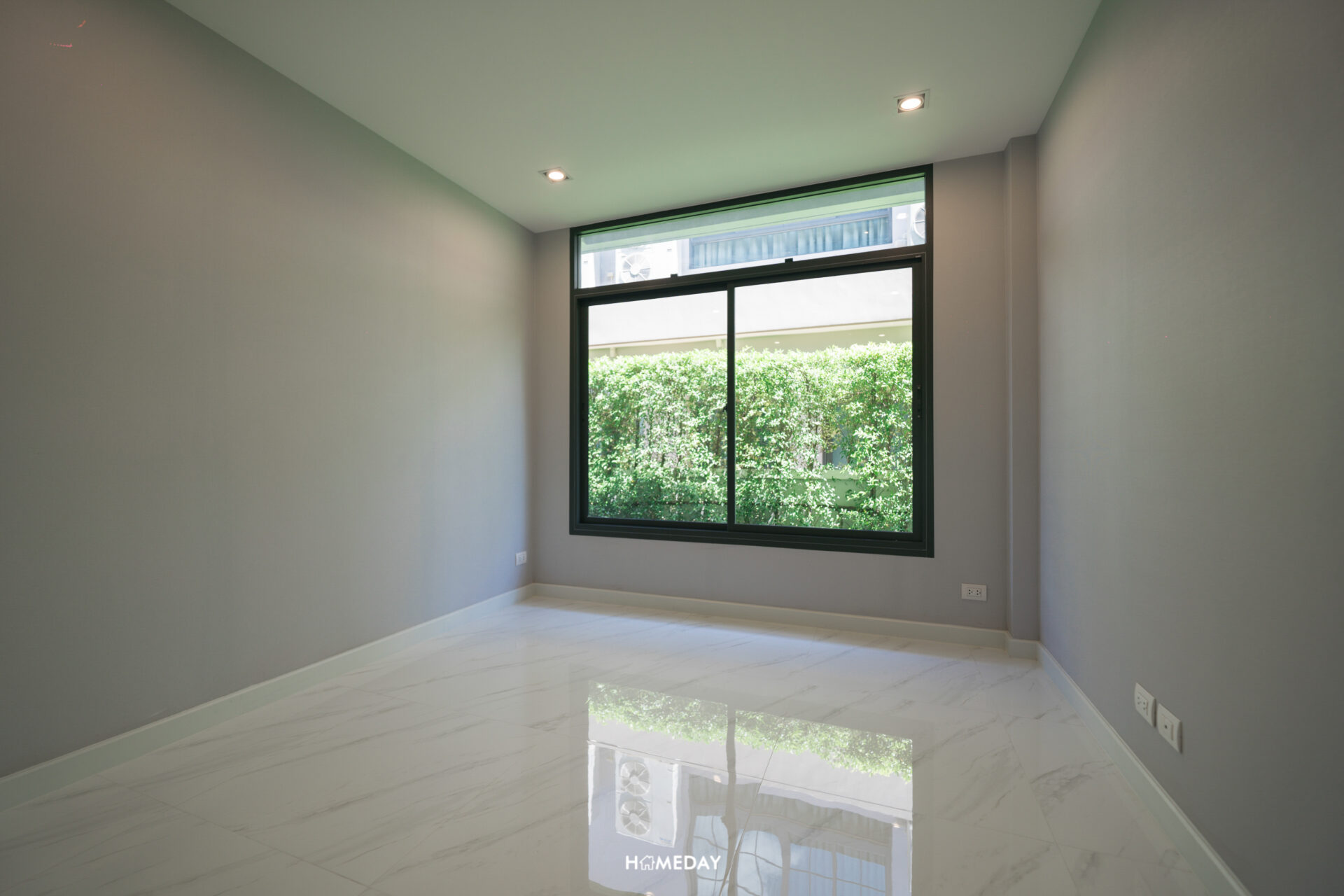 ตรงข้ามกับประตูโรงจอดรถ บริเวณนี้จะเป็นห้องอเนกประสงค์ชั้นล่าง ที่สามารถปรับเป็นห้องนอนได้ครับ ภายในขนาดเหมาะสำหรับเตียงขนาด 3.5 ฟุต พร้อมพื้นที่สำหรับวางเฟอร์นิเจอร์พื้นฐานอย่างตู้เสื้อผ้าและโต๊ะเครื่องแป้งได้ เหมาะมากสำหรับผู้สูงอายุ หรือจะปรับเป็นห้องทำงาน, โรงภาพยนตร์ส่วนตัว, ห้องอ่านหนังสือ, พื้นที่สำหรับสัตว์เลี้ยง ฯลฯ ก็ได้ครับ ขึ้นอยู่กับไลฟ์สไตล์ของผู้อยู่อาศัยได้เลย ด้านในห้องได้บ้านหน้าต่างขนาดใหญ่เต็มผนังมาด้วย ช่วยเพิ่มความโปร่งให้กับห้องได้เป็นอย่างดี ส่วนประตูทางเข้าเป็นประตูสไลด์บานกระจก ช่วยให้ห้องไม่ทึบอีกด้วยครับ