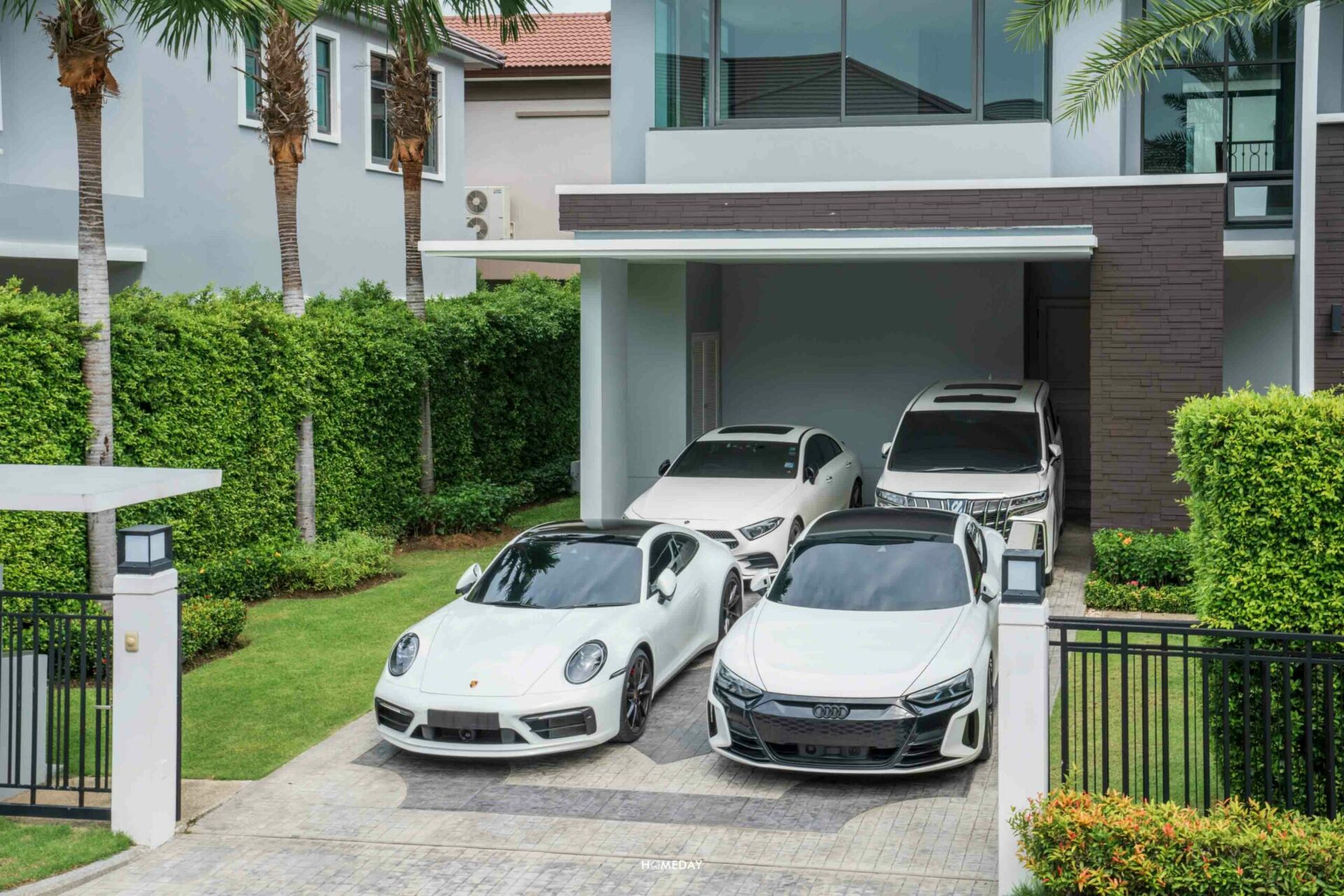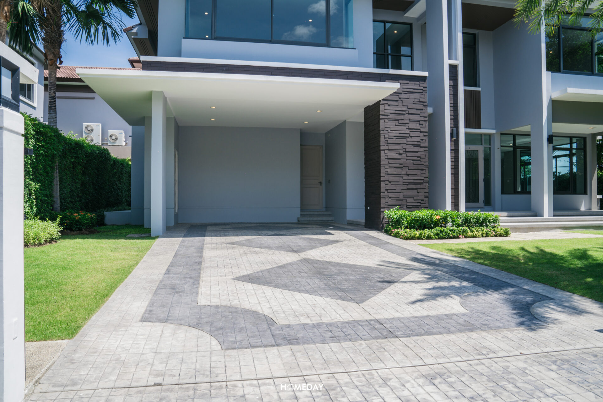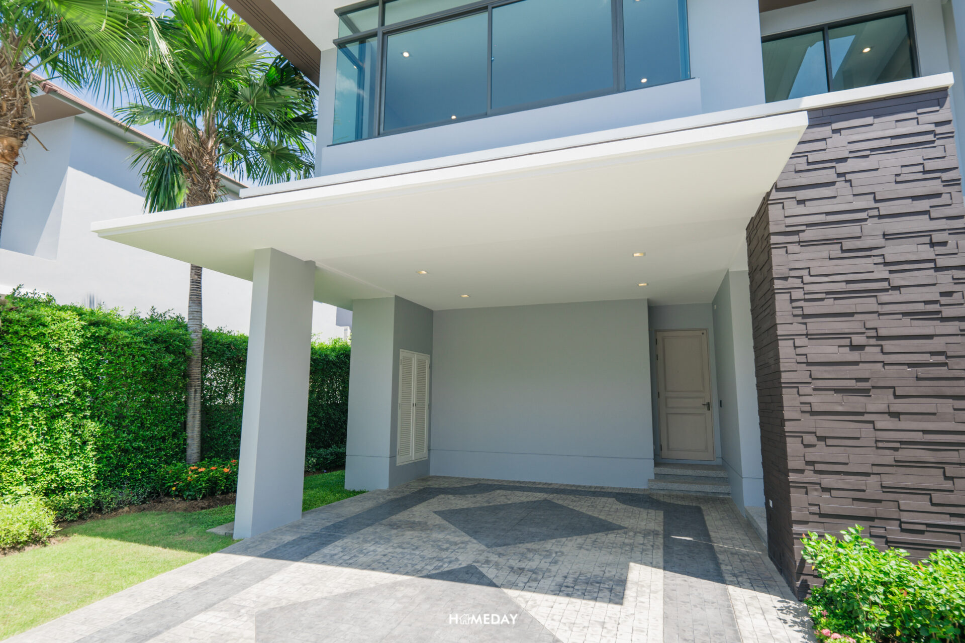 โรงจอดรถของแบบบ้านนี้สามารถจอดได้สูงสุด 4 คัน โดยจะได้พื้นที่จอดในร่ม 2 คันครับ ตัวพื้น Stamped Concrete ลวดลายสวยงาม เข้ากับตัวบ้าน มาพร้อมทางเข้าเชื่อมโรงจอดรถ และห้องเก็บของ สำหรับใช้เก็บอุปกรณ์ทำสวนและอุปกรณ์ทำความสะอาดรถครับ