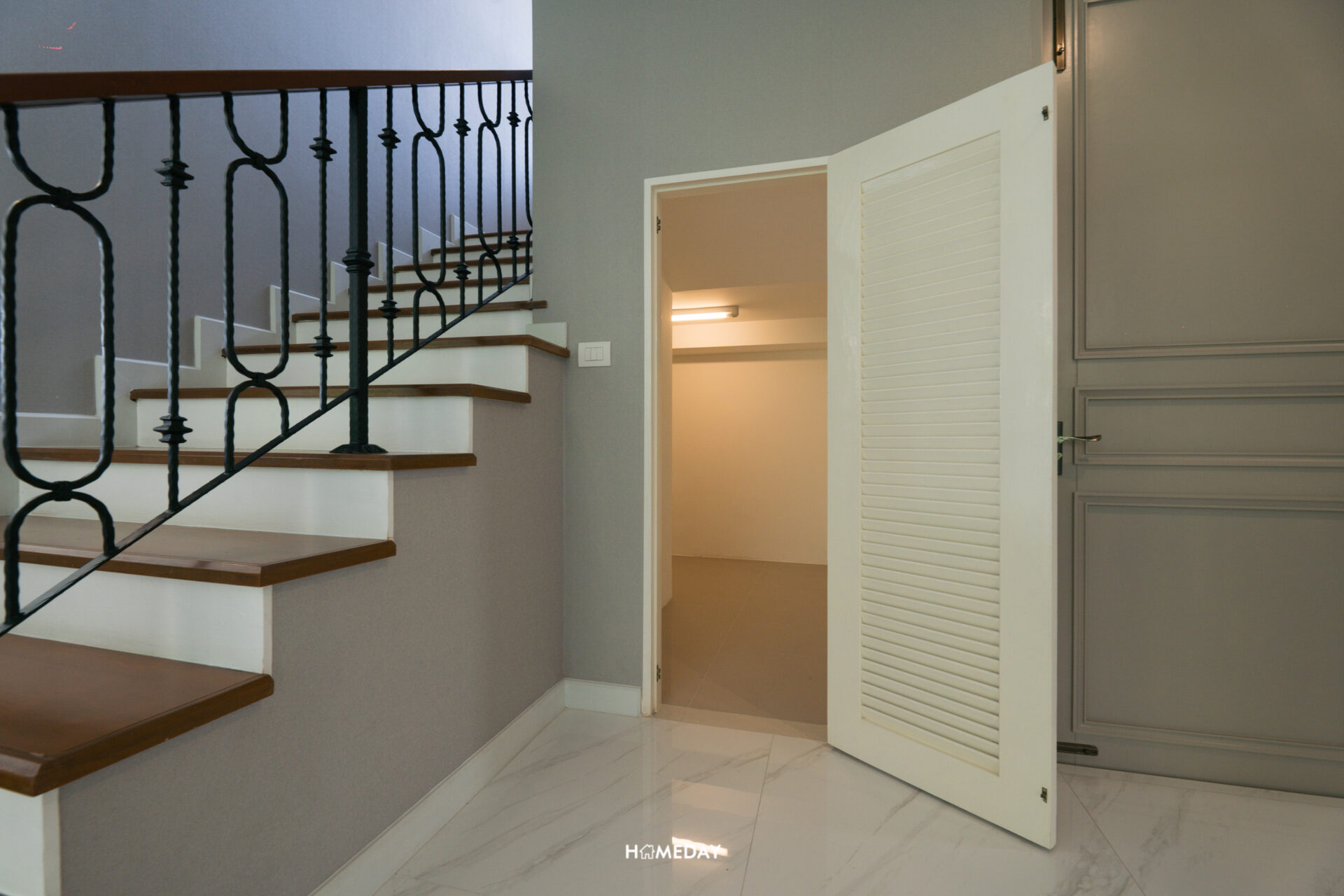 พื้นที่ใต้บันไดออกแบบเป็นห้องเก็บของ ด้านในมีไฟมาให้พร้อม สามารถใช้เก็บกระเป๋าเดินทาง อุปกรณ์ทำความสะอาด อุปกรณ์งานช่างต่าง ๆ หรือของที่ไม่ค่อยได้หยิบใช้บ่อยก็ได้เช่นครับ ติดกันกับห้องเก็บของจะเป็นประตูทางเข้าฝั่งโรงรถครับ