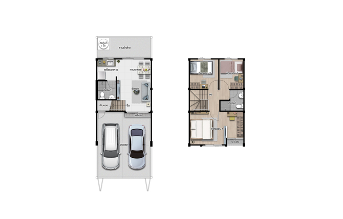 ชั้น 1 ที่จอดรถ 2 คัน, เฉลียงหน้าบ้าน, พื้นที่รับแขก, พื้นที่รับประทานอาหาร, ห้องนํ้า,พื้นที่เตรียมอาหาร, ลานซักล้างพร้อมพื้นที่สำหรับครัวไทย (เตรียมท่อนํ้าดี/นํ้าทิ้งให้),ห้องเก็บของชั้น 2 ห้องนอนใหญ่ พร้อมระเบียง, ห้องนอน 2, ห้องนอน 3, ห้องนํ้า, โถงบันได