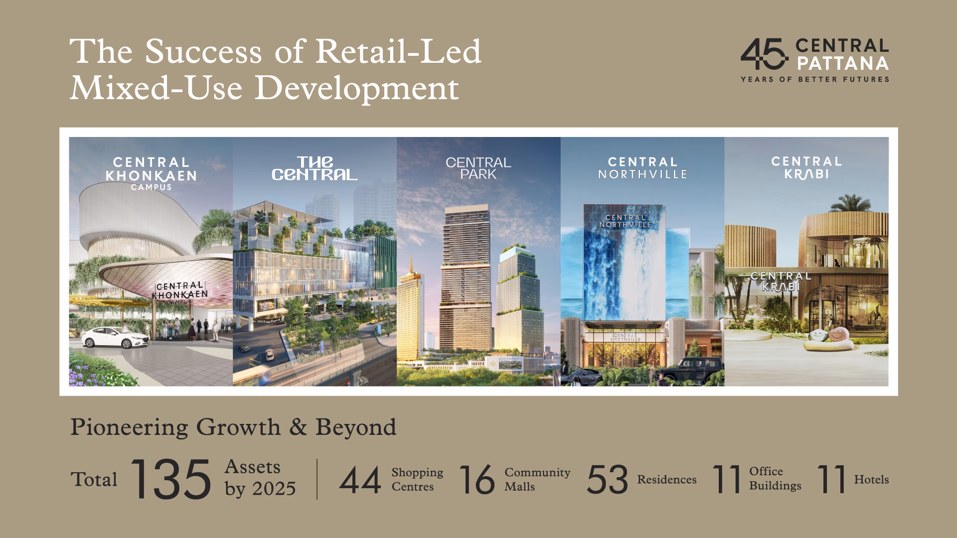 ตลอด 45 ปีที่ผ่านมา เซ็นทรัลพัฒนาเติบโตเคียงข้างลูกค้า คู่ค้า พนักงาน และชุมชน ด้วยกลยุทธ์ Retail-Led Mixed-Use Development ที่ไม่เพียงสร้างแลนด์มาร์ก แต่ยังสร้างชีวิต สร้างโอกาส และสร้างอนาคตที่ดีให้กับทุกคน ทั้งนี้เซ็นทรัลพัฒนาเดินหน้าแผนการลงทุนกว่า 120,000 ล้านบาทใน 5 ปี (2568-2572) เพื่อเปิดตัวเมกะโปรเจ็กต์และโครงการใหม่ทั่วประเทศ โดยโครงการ ‘Central Park’ ได้เปิดตัวและสร้างปรากฏการณ์ Par Life & Urban Life Integration อย่างยิ่งใหญ่ไปแล้ว และในเดือน ต.ค. 68 นี้ เตรียมเปิดโครงการ Central Krabi มิกซ์ยูสยิ่งใหญ่แห่งแรกของกระบี่พร้อมส่งเสริมด้าน Sustainable Tourism สอดคล้องกับนโยบายของเมือง และตามด้วยเมกะโปรเจ็กต์ในแผนงาน นำโดย ‘The Central’ พหลโยธิน ที่จะพลิกโฉมย่านให้กลายเป็น New CBD แห่งใหม่ของกรุงเทพฯ