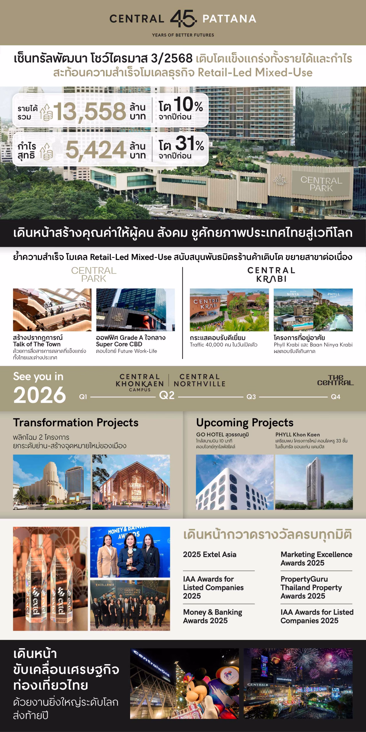 กรุงเทพฯ: บริษัท เซ็นทรัลพัฒนา จำกัด (มหาชน) เปิดผลประกอบการไตรมาส 3 ปี 2568 เติบโตมั่นคงต่อเนื่องจากธุรกิจศูนย์การค้า บริษัทฯ มีรายได้รวม 13,558 ล้านบาท โต 10% และกำไรสุทธิ 5,424 ล้านบาท โต 31% จากปีก่อน พร้อมฐานะทางการเงินแข็งแกร่งด้วยอัตราภาระหนี้สินต่อทุน (D/E Ratio) ที่ 0.50 เท่า สร้างผลตอบแทนเพิ่มขึ้นต่อเนื่องให้กับผู้ถือหุ้นในปี 2568 เดินหน้าขับเคลื่อนสร้างการเติบโตตามแผน ปี 2569 พัฒนาโครงการมิกซ์ยูส ‘Central Khonkaen Campus’ โครงการแห่งที่ 2 ในจังหวัดขอนแก่น และ ‘Central Northville’ รัตนาธิเบศร์ โครงการที่ใหญ่ที่สุดในจังหวัดนนทบุรี ในไตรมาส 2 และเปิดตัวเมกะโปรเจกต์ ‘The Central’ พหลโยธิน ศูนย์การค้าแฟล็กชิพแห่งอนาคต ไตรมาส 4 ตอกย้ำบทบาทผู้นำการพัฒนาเมืองและเศรษฐกิจไทย ภายใต้แนวคิด ‘The Ecosystem for All’ เชื่อมโยงศักยภาพของทุกภาคส่วน ทั้งธุรกิจ ชุมชน สังคม และสิ่งแวดล้อม ให้เติบโตไปด้วยกันอย่างแข็งแกร่งและยั่งยืน