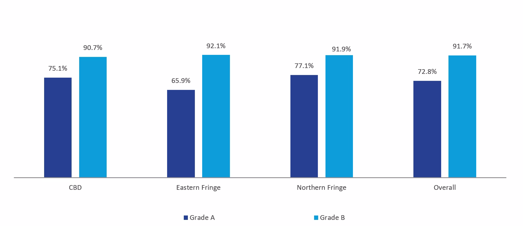 อัตราการเช่าอาคารสำนังานเกรดเอและเกรดบีในกรุงเทพมหานคร  ณ สิ้น ไตรมาสที่ 3 ปี พ.ศ. 2568