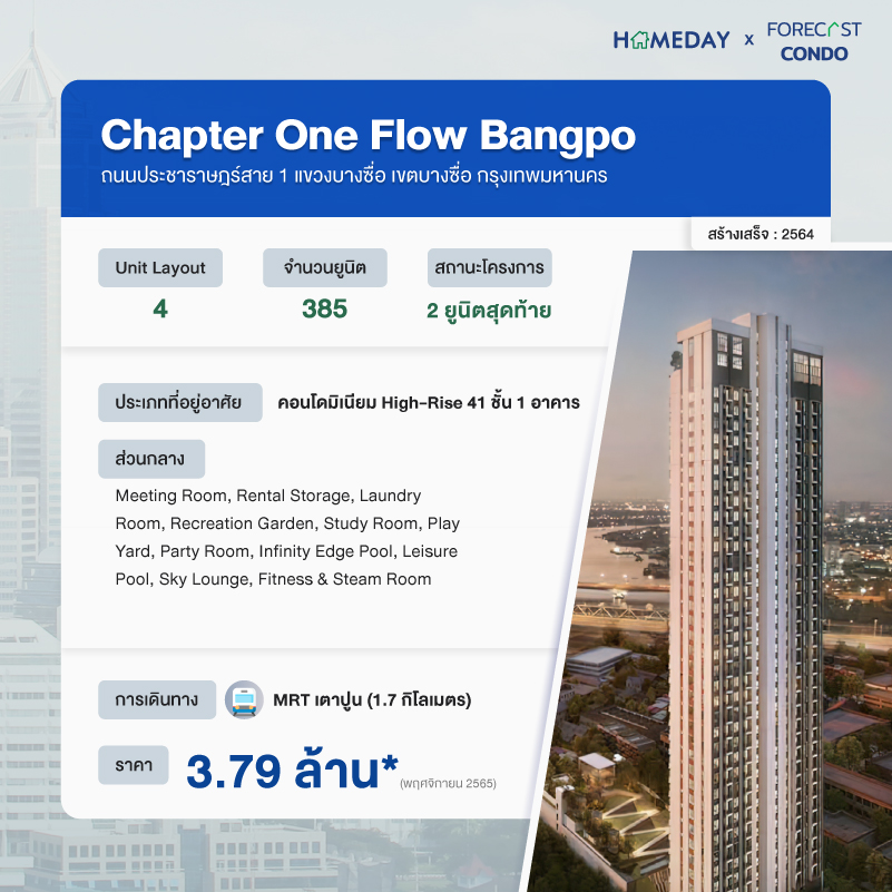 แชปเตอร์ วัน โฟลว์ บางโพ (Chapter One Flow Bangpo) พัฒนาโดยบริษัท พฤกษา โฮลดิ้ง จำกัด ขนาดห้องเริ่มต้น 31.8-64.75 ตร.ม. คอนโดมิเนียมตากอากาศวิวแม่น้ำเจ้าพระยาสูง 41 ชั้น ออกแบบมาเพื่อหลีกหนีจากความวุ่นวายของเมือง ภายใต้บรรยากาศ Modern Resort ให้การพักผ่อนเชื่อมต่อกับธรรมชาติได้อย่างสมบรูณ์แบบ ใกล้ MRT เตาปูน 1.7 กิโลเมตร
