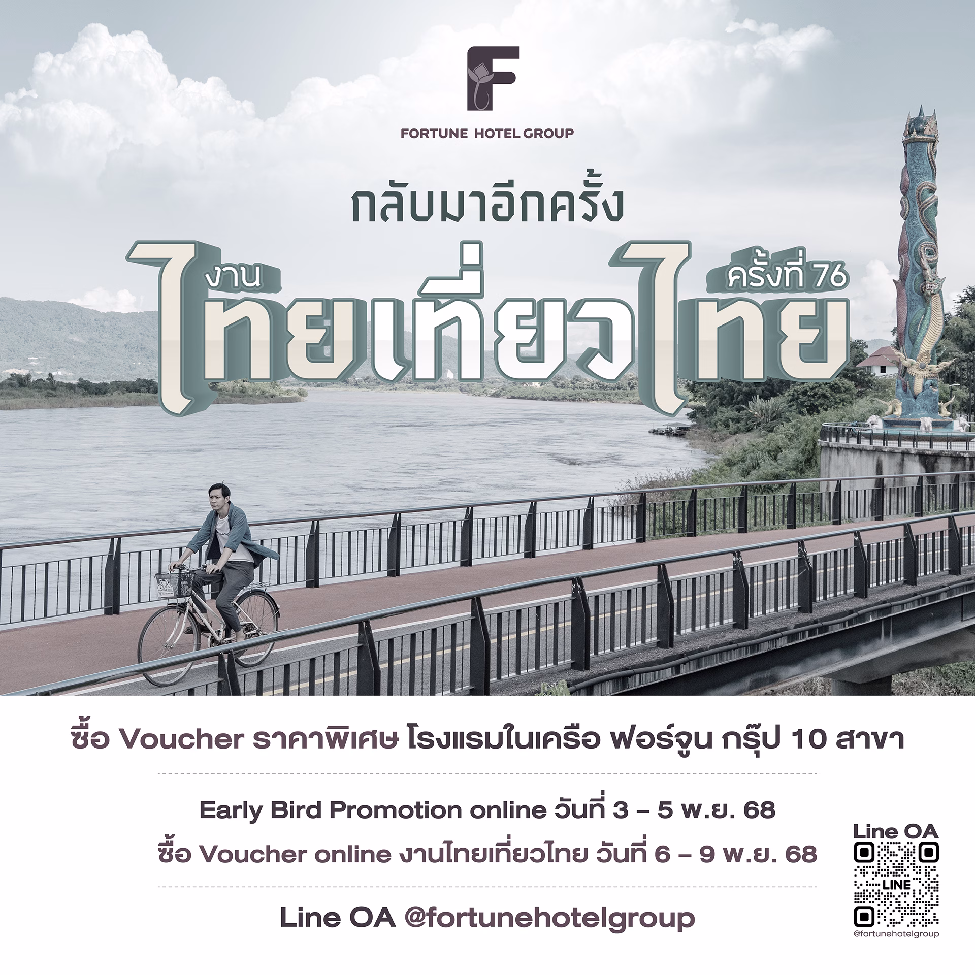 Early Bird Online Promotion! จองก่อน คุ้มก่อน! พิเศษสำหรับนักท่องเที่ยวที่ไม่อยากพลาดราคาดีที่สุด Pre-Sale Voucher Online วันที่ 3–5 พฤศจิกายน 2568 ผ่านทาง Line Official Account ของโรงแรมแต่ละสาขาและเปิดขายออนไลน์ทั่วไป วันที่ 6–9 พฤศจิกายน 2568 ผ่านทั้ง Line OA และ Facebook ของแต่ละโรงแรมในเครือ Voucher online โรงแรมในเครือ ฟอร์จูน กรุ๊ป ทั้ง 10 สาขา ในวันที่ 6 – 9 พฤศจิกายน 2568 ผ่านช่องทาง Line OA และ Facebook ของโรงแรมแต่ละสาขา