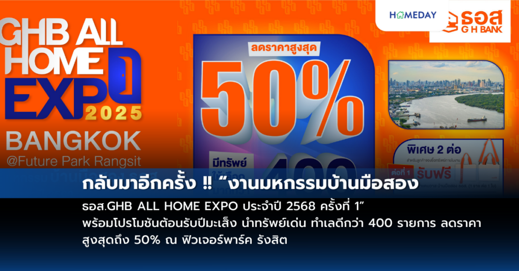 กลับมาอีกครั้ง !! “งานมหกรรมบ้านมือสอง ธอส.GHB ALL HOME EXPO ประจำปี 2568 ครั้งที่ 1” พร้อมโปรโมชันต้อนรับปีมะเส็ง นำทรัพย์เด่น ทำเลดีกว่า 400 รายการ ลดราคาสูงสุดถึง 50% ณ ฟิวเจอร์พาร์ค รังสิต