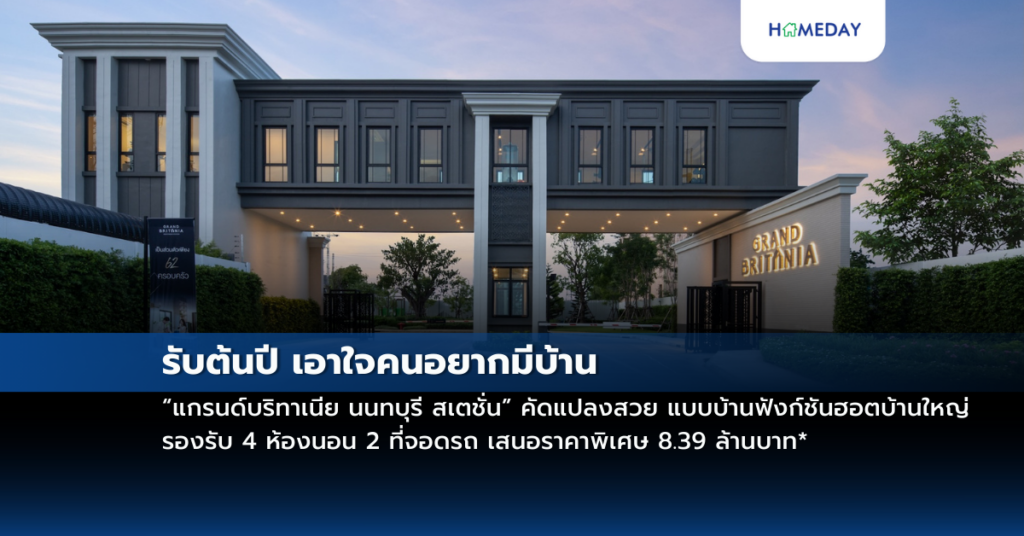 รับต้นปี เอาใจคนอยากมีบ้าน “แกรนด์บริทาเนีย นนทบุรี สเตชั่น” คัดแปลงสวย แบบบ้านฟังก์ชันฮอตบ้านใหญ่ รองรับ 4 ห้องนอน 2 ที่จอดรถ เสนอราคาพิเศษ 8.39 ล้านบาท*