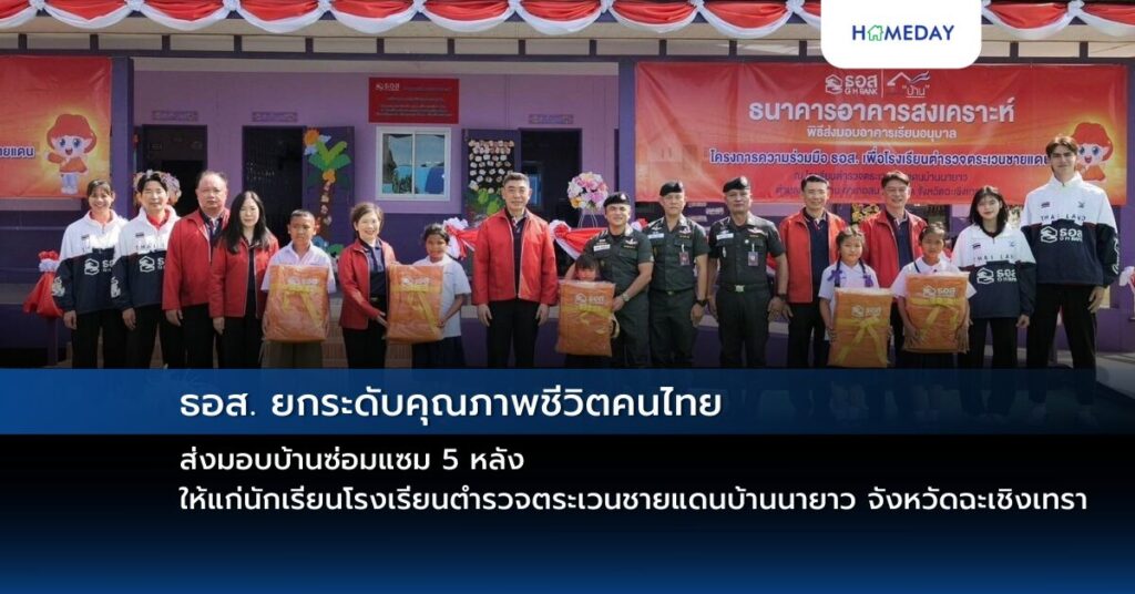 28 November 2024ธนาคารอาคารสงเคราะห์ ยกระดับคุณภาพชีวิตคนไทยในพื้นที่ถิ่นทุรกันดาร ส่งมอบบ้านที่ซ่อมแซมแล้วเสร็จ จำนวน 5 หลัง ให้แก่นักเรียนโรงเรียนตำรวจตระเวนชายแดนบ้านนายาว ตำบลท่ากระดาน อำเภอสนามชัยเขต จังหวัดฉะเชิงเทรา พร้อมมอบไฟส่องสว่างโซล่าเซลล์ และเครื่องอุปโภคบริโภค ภายใต้ “โครงการสร้าง/ซ่อมแซมที่อยู่อาศัย