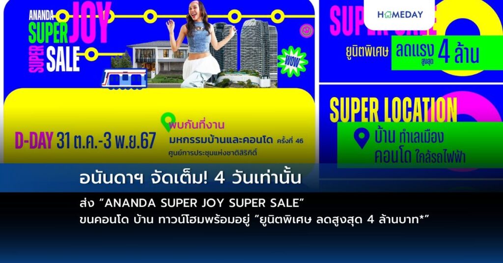 22 October 2024บริษัท อนันดา ดีเวลลอปเม้นท์ จำกัด (มหาชน) หรือ ANAN ผู้นำแห่งวงการพัฒนาที่อยู่อาศัยสำหรับคนเมือง ครองตำแหน่งผู้นำตลาดคอนโดมิเนียมติดรถไฟฟ้า มุ่งมั่นพัฒนาที่อยู่อาศัยเพื่อตอบโจทย์ชีวิตคนเมืองได้อย่างลงตัวที่สุด เตรียมจัดหนักลุยไตรมาส 4 เต็มสปีด ส่งโปรโมชั่น “ANANDA SUPER JOY SUPER SALE” ร่วมงานมหกรร