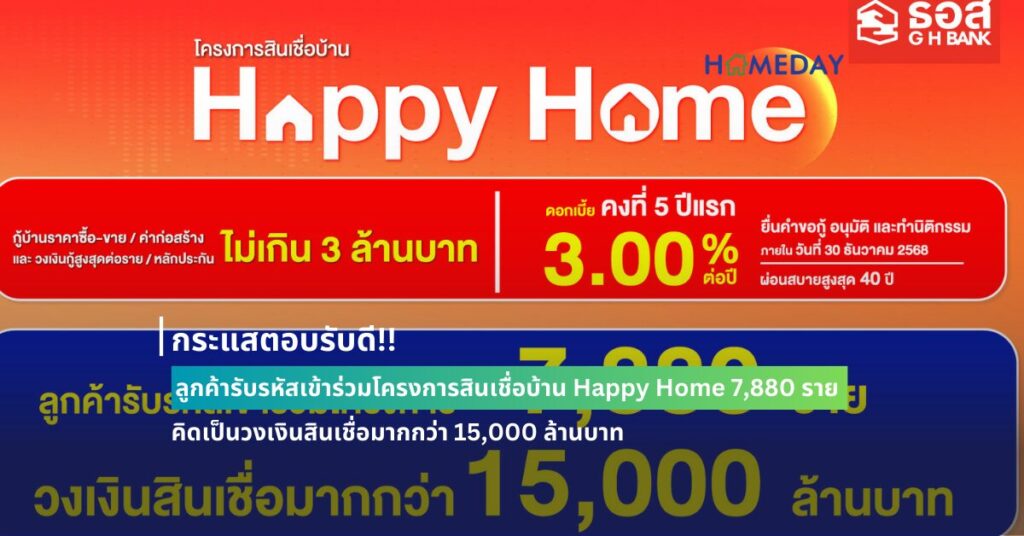 26 April 2024ธนาคารอาคารสงเคราะห์ (ธอส.) จัดทำโครงการสินเชื่อบ้าน Happy Home เพื่อส่งเสริมให้คนไทยมีที่อยู่อาศัยเป็นของตนเอง และยกระดับคุณภาพชีวิตของประชาชนให้เป็นไปอย่างมีประสิทธิภาพ ตามนโยบายรัฐบาล และกระทรวงการคลัง ให้กับผู้ที่ต้องการที่อยู่อาศัยในระดับไม่เกิน 3 ล้านบาท อัตราดอกเบี้ยคงที่ 5 ปีแรก เท่ากับ 3.00