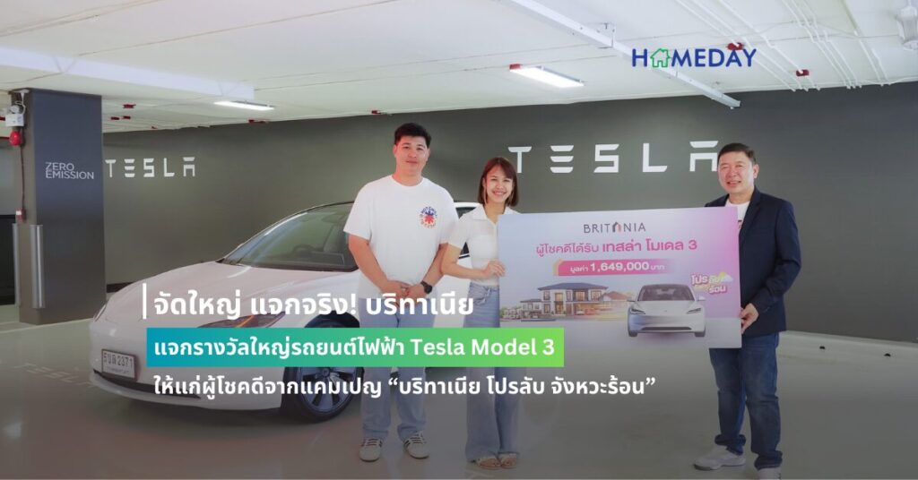 16 September 2024บริทาเนีย ผู้นำในการพัฒนาอสังหาริมทรัพย์ ที่มุ่งมั่นพัฒนาที่อยู่อาศัยเพื่อสังคมที่ดีอย่างยั่งยืน โดย นายนาวิน เล็กนาวา กรรมการผู้จัดการฝ่ายพัฒนาโครงการ บริษัท บริทาเนีย จำกัด (มหาชน) มอบรางวัลรถยนต์ไฟฟ้า Tesla Model 3 มูลค่า 1,649,000 บาท ให้แก่ลูกค้าผู้โชคดี จากแคมเปญ “บริทาเนีย โปรลับ จังหวะร้อน”