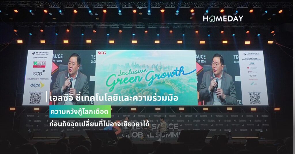 9 August 2024เอสซีจี ร่วมแบ่งปันมุมมองบนเวที Techsauce Global Summit 2024 ชี้ประเด็น เราจะอยู่กันอย่างไร? หากอุณหภูมิโลกพุ่งสูงเกินกว่าจุดที่จะแก้ไขและอยู่ได้ โจทย์ความยั่งยืนวันนี้จึงต้องเร่งทั้งลดการปล่อยคาร์บอนไดออกไซด์ ฟื้นฟูธรรมชาติ และดูแลสังคม โดยใช้เทคโนโลยีและความร่วมมือเป็นกุญแจสำคัญ นายธรรมศักดิ์ เศร