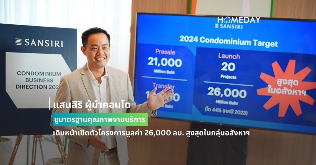 14 June 2024แสนสิริ 40 ปี ย้ำความแข็งแกร่งเบอร์หนึ่งผู้พัฒนาคอนโดมิเนียมของวงการอสังหาริมทรัพย์ไทย ประกาศแผนธุรกิจคอนโดมิเนียมปี 2567 วางแผนเปิดตัวคอนโด 20 โครงการใหม่ มูลค่ารวม 26,000 ล้านบาท สูงสุดในกลุ่มธุรกิจอสังหาฯด้วยเป้าหมายสร้างยอดขายคอนโด 21,000 ล้านบาท และสร้างยอดโอนคอนโด 13,000 ล้านบาทชู Strategic Lo