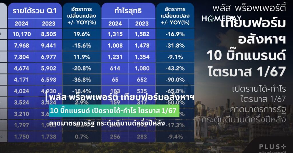 18 May 2024พลัส พร็อพเพอร์ตี้ ชี้ให้เห็นถึงแนวโน้มของเศรษฐกิจไทยปี 2567 ที่มีความท้าทาย 10 บริษัทบิ๊กแบรนด์ในธุรกิจอสังหาฯ ประกาศผลประกอบการไตรมาสแรก ทำรายได้รวมมากกว่า 4.9 หมื่นล้านบาท เมื่อเทียบกับปี66 ในช่วงเวลาเดียวกันยังมีรายได้รวมที่ต่ำกว่าเล็กน้อย ถือเป็นปีที่ผู้ประกอบการในธุรกิจอสังหาฯต้องใช้ความระมัด
