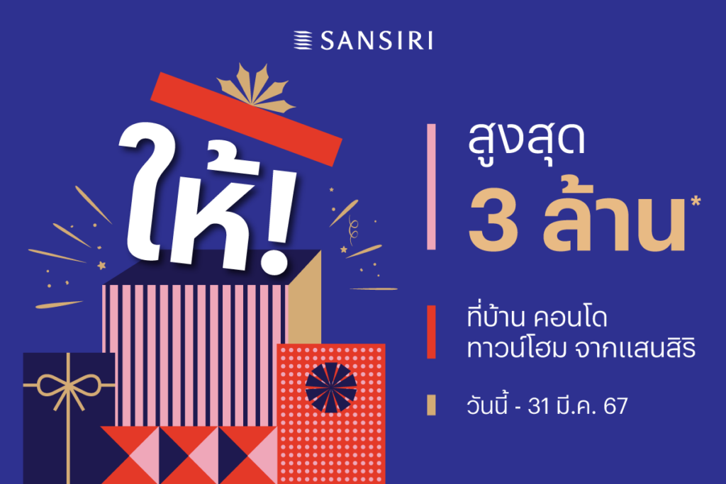 2 January 2024แสนสิริ ผู้พัฒนาอสังหาริมทรัพย์ชั้นนำของประเทศ ประกาศรุก Q1 ตลาดอสังหาฯ ต้นปี 2567 ส่งโปรโมชันสุดยิ่งใหญ่ ‘แสนสิริ ให้!’ จัดให้! คนอยากมีบ้าน-คอนโด-ทาวน์โฮม เปย์ฉ่ำๆ กับโปรโมชันสุดพิเศษขอบคุณลูกค้า ได้มีบ้านเป็นของขวัญต้อนรับปีใหม่ คัดรวม 85 โครงการคุณภาพพร้อมเข้าอยู่ทั่วประเทศ ทุกทำเล รับดีมานด์ลูก