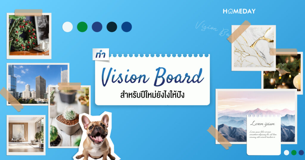 13 December 2023การทำ Vision Board เป็นหนึ่งในวิธีที่ดีที่สุดในการรักษาเป้าหมาย ความฝัน และแรงบันดาลใจของเราให้มองเห็นได้ชัดเจนยิ่งขึ้น Vision Board จะช่วยให้เรามีสมาธิและขับเคลื่อนแรงจูงใจในการบรรลุเป้าหมายได้ ไม่ว่าเป้าหมายเหล่านั้นจะเล็กหรือใหญ่ วันนี้ Homeday เลยรวบรวมเคล็ดลับและแนวคิดเกี่ยวกับ Vision Board มาฝ