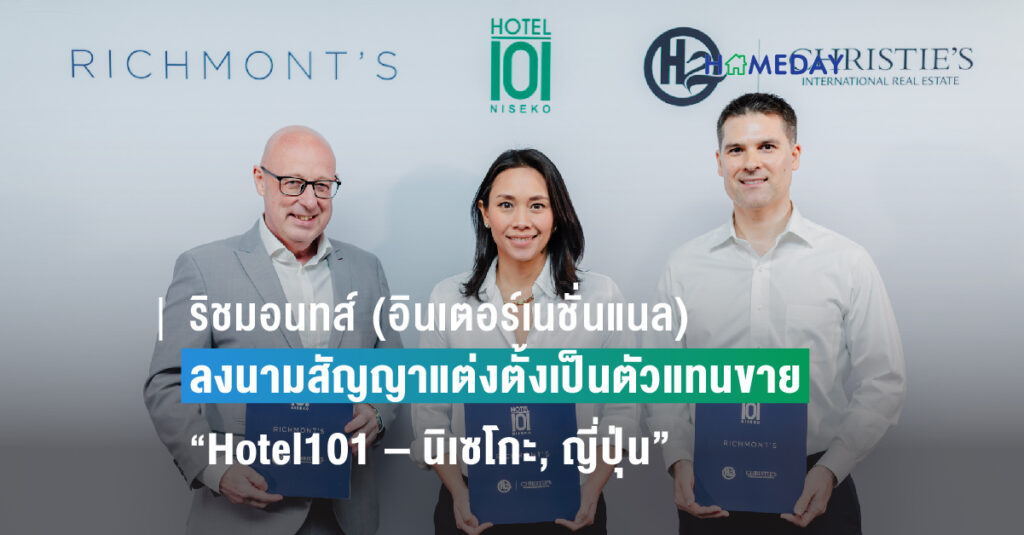 26 October 2023บริษัท ริชมอนทส์ (อินเตอร์เนชั่นแนล) จำกัด บริษัทที่ปรึกษาทางด้านการตลาดและการขายอสังหาริมทรัพย์ชั้นนำ นำโดย นายทิม สเคพวิงตัน (คนแรกจากซ้าย) กรรมการผู้จัดการ ลงนามสัญญาแต่งตั้งตัวแทนขายอย่างเป็นทางการแต่เพียงรายเดียวในประเทศไทย โครงการ “Hotel101 – นิเซโกะ, ญี่ปุ่น” (Hotel101 – Niseko, Japan)…