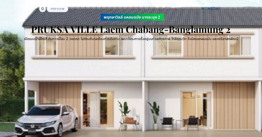 พรีวิว พฤกษาวิลล์ แหลมฉบัง บางละมุง 2 (PRUKSA VILLE Laem Chabang-Banglamung 2) เปิดแบบบ้านใหม่!! กับทาวน์โฮม 2 จอดรถ ไม่ต้องกังวลเรื่องการเดินทาง เพราะโครงการตั้งอยู่บนทำเลศักยภาพ ใกล้สุขุมวิท ถึงนิคมแหลมฉบัง และเครือฯสหพัฒน์